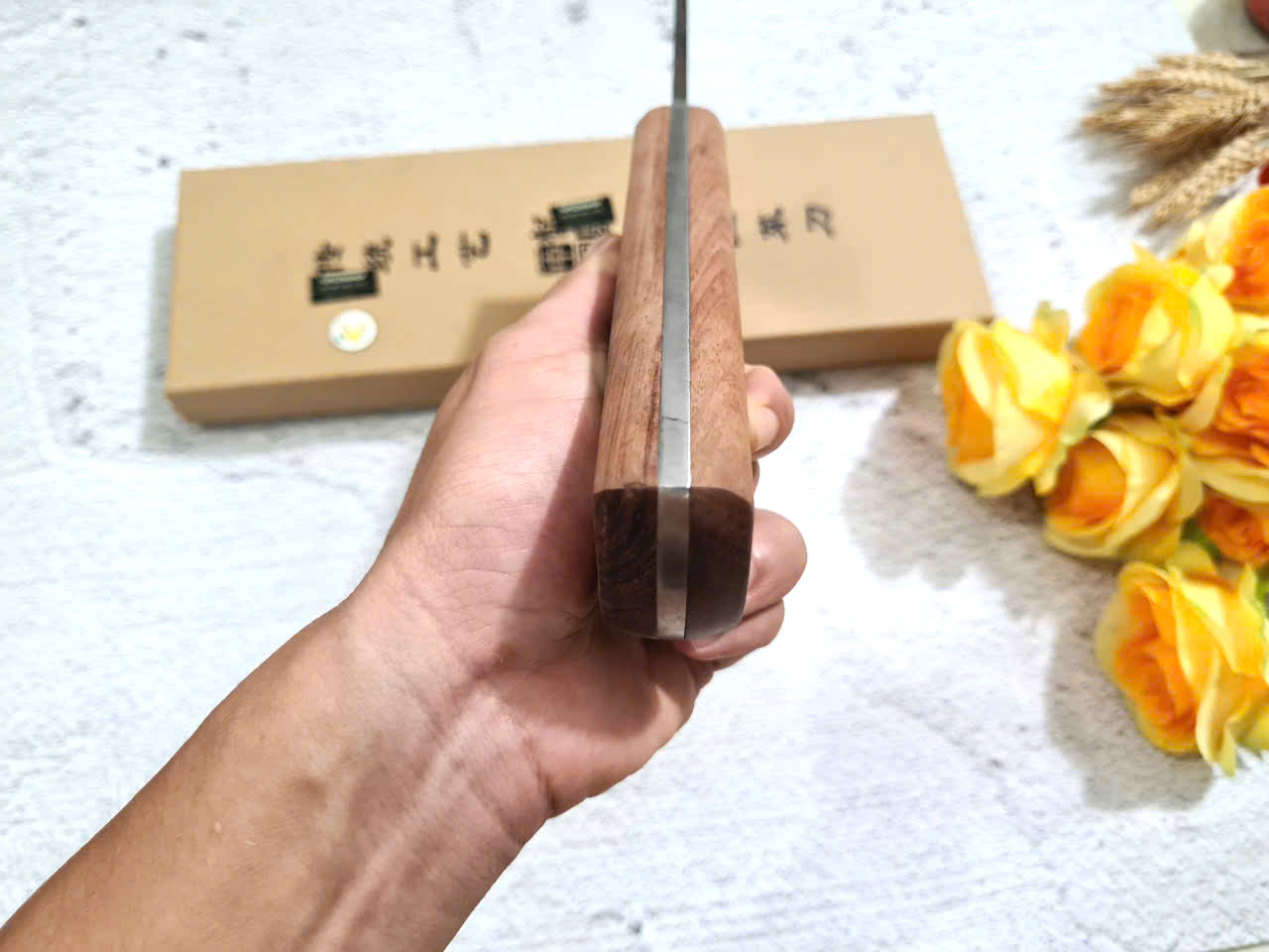 - Chức năng: chuyên chặt thái cá, chặt gà, lọ - Kích thước: Lưỡi: 26cm, cán: 12,5cm, rộng: 6,5cm, dầy: 4ly, trọng lượng: 480g - Cán : Gỗ mun , Khâu và chốt đồng đỏ