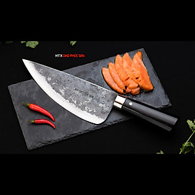 - Chức năng: thái thịt, rau củ quả - Kích thước: Lưỡi: 17cm, cán: 12cm, rộng: 5cm, dầy: 1ly, trọng lượng: 200g - Cán : Gỗ cẩm chỉ, Chốt, Khâu ĐỒNG ĐỎ , keo liên