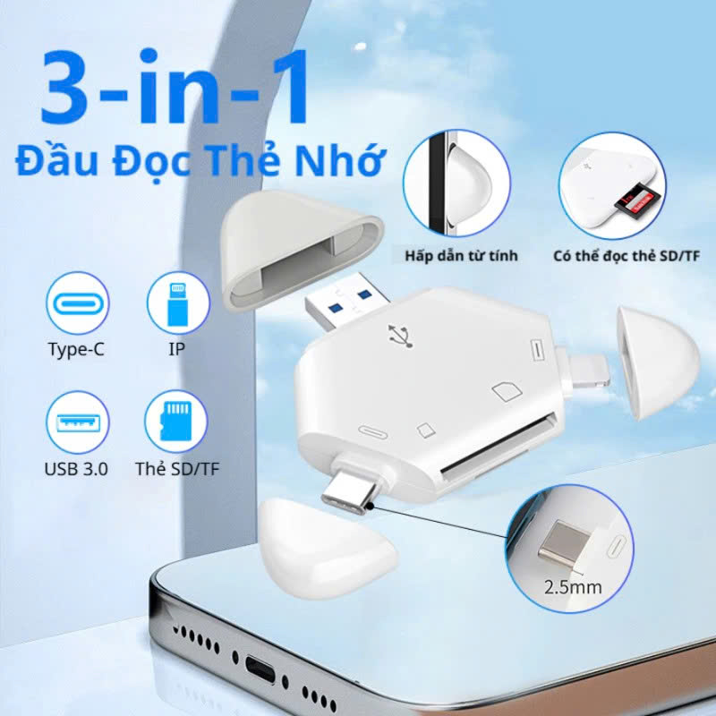 Mô tả sản phẩm Thông số sản phẩm : Chất liệu : Nhựa ABS Kích thước : 65x65x65 mm Cổng kết nối : Type C, USB, L 8 pin Đầu đọc thẻ : SD ,