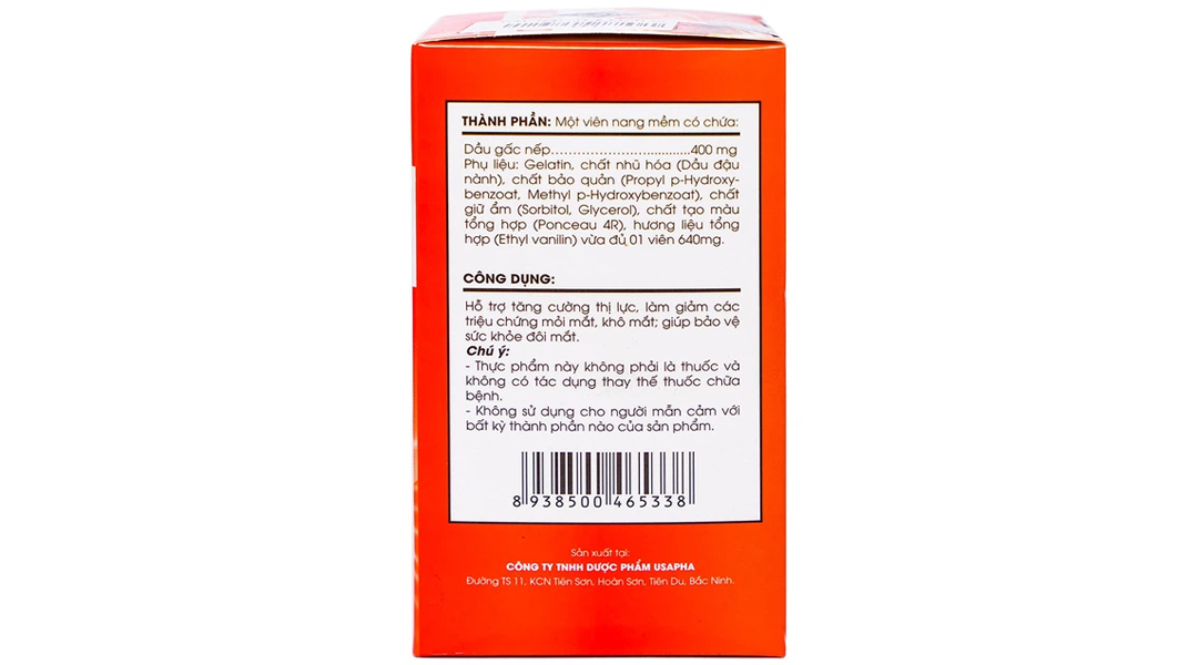 Thành phần Một viên nang mềm có chứa: Dầu gấc nếp: 400mg Công dụng Hỗ trợ tăng cường thị lực, làm giảm các triệu chứng mỏi mắt, khô mắt, giúp bảo vệ sức khỏe đôi