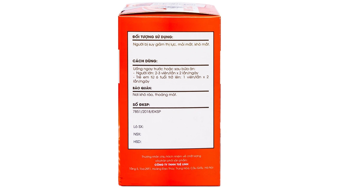 Quy cách đóng gói: Hộp - 30 viên. Nhà phân phối: CÔNG TY TNHH MEDPACK PLUS. CÔNG DỤNG Hỗ trợ cải thiện thị lực, tốt cho mắt. Đối tượng sử dụng: Người lớn.