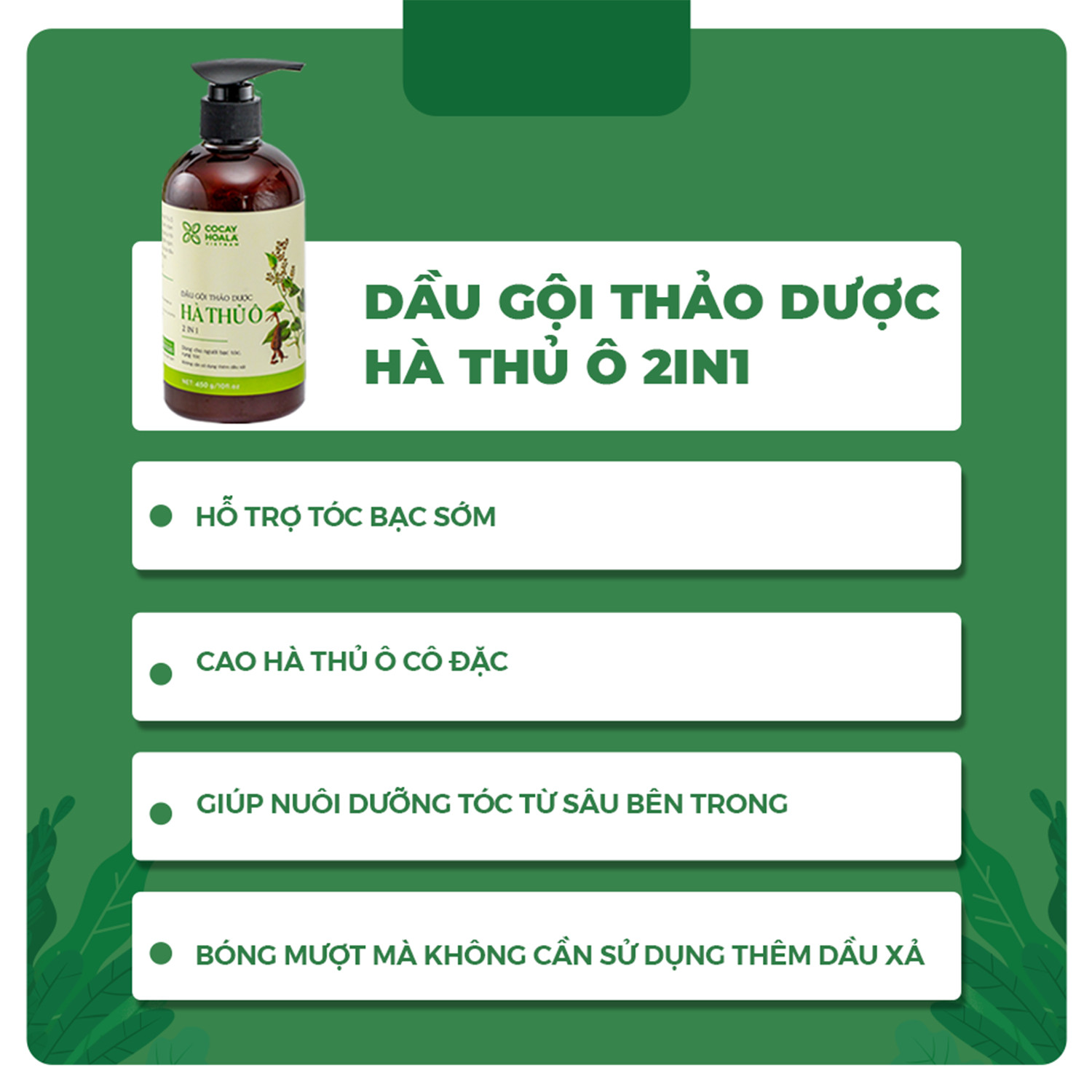Thành phần: Chiết xuất từ cỏ màn trầu, chiết xuất bồ kết, hà thủ ô, dầu macadamia, tinh dầu bưởi, tinh dầu gừng, tinh dầu tràm trà, tinh dầu bạc hà, tinh dầu sả chanh,