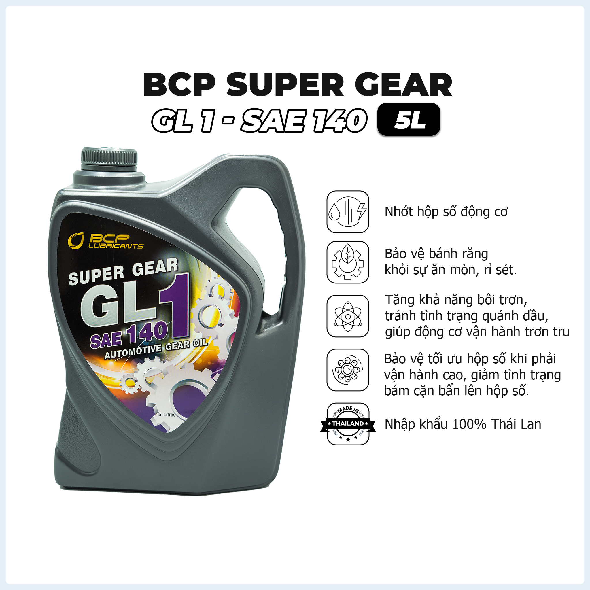 DẦU HỘP SỐ (NHỚT CẦU) Ô TÔ, XE TẢI, MÁY CÀY, XE BA GÁC CAN 5 LÍT - BCP SUPER GEAR SAE 140, SAE 90 (NHẬP KHẨU THÁI LAN 100%) Dầu hộp số ô tô, xe tải (còn gọi là nhớt cầu ô tô, xe tải) BCP Thái Lan can 5 Lít có hai dòng: nhớt cầu 140 và nhớt cầu 90. Nhớt hộp số ô tô BCP Thái Lan là dòng sản phẩm nhập khẩu 100% từ Hãng Bangchak. Sự kết hợp giữa dầu gốc chất lượng cao và phụ gia đặc biệt theo công thức độc quyền của BCP giúp động cơ vận hành ổn định, êm ái ở nhiệt độ cao, tải trọng lớn mà vẫn bảo vệ tối ưu hộp số xe bạn. Sản phẩm có dung tích 5 Lít với giá cả tiết kiệm so với các sản phẩm khác cùng loại trên thị trường chỉ 4 Lít.