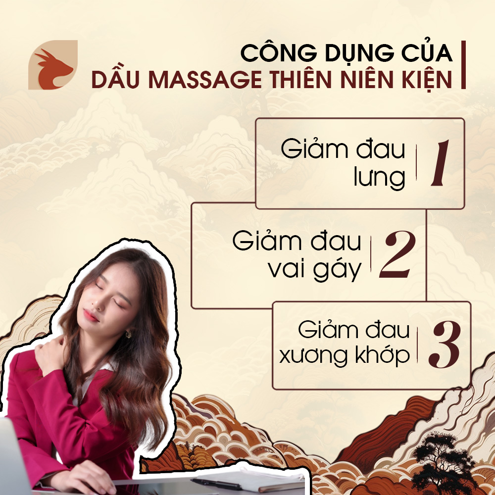 - Tinh dầu thiên niên kiện: giảm đau mỏi vai gáy xương khớp, lưng, kích thích tuần hoàn máu