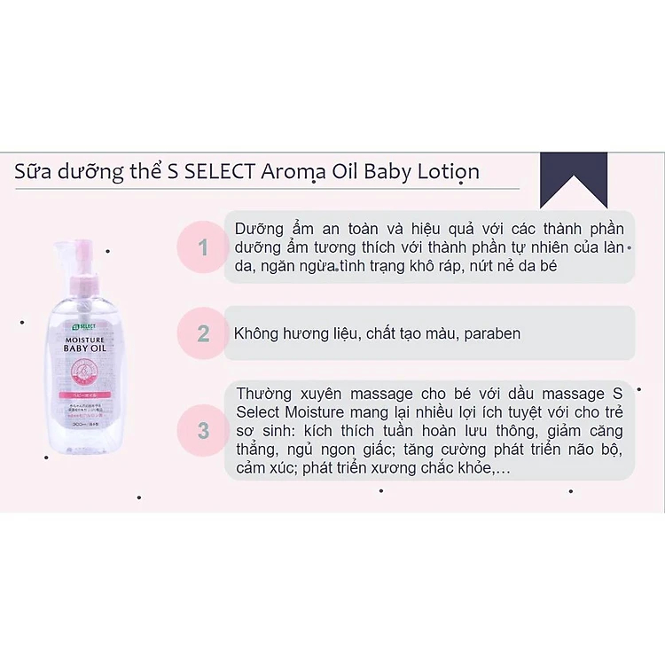 Mua tại TiktokThành phần Mineral Oil, Squalane, Sodium Hyaluronate, Cetyl-PG Hydroxyethyl Palmitamide, Arginine, Tocopheryl Acetate. Công dụng Sản phẩm giúp tăng cường độ ẩm và làm mềm mịn da, giúp ngăn ngừa và cải thiện tình trạng da thô ráp, bong tróc, sần sùi do thiếu ẩm, dưỡng da mềm mại, mịn màng. HDSD: Lấy một lượng sản phẩm vừa đủ ra lòng bàn tay sau đó thoa đều lên da và nhẹ nhàng massage khắp cơ thể bé. Lưu ý: Ngưng sử dụng và hỏi ý kiến bác sĩ nếu da bị kích ứng với các biểu hiện: nổi mẩn đỏ, sưng, ngứa. Tránh để sản phẩm tiếp xúc trực tiếp với mắt. Để xa tầm tay trẻ em. Bảo quản: Nơi khô ráo, thoáng mát, tránh tiếp xúc ánh sáng trực tiếp.