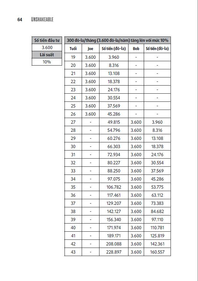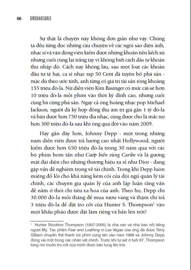 Sau khi phỏng vấn những chuyên gia tài chính và nhà đầu tư lừng lẫy nhất thế giới, Anthony Robbins đã đúc kết những bài học và bí quyết thành công của họ vào quyển sách này. Kết hợp với những lời khuyên giá trị từ Peter Mallouk, nhân vật duy nhất trong lịch sử tài chính được vinh danh là chuyên gia tư vấn tài chính hàng đầu thế giới trong ba năm liên tiếp, Unshakeable xứng đáng là quyển sách gối đầu giường về tự do tài chính.