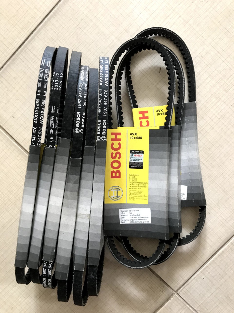 Mô tả sản phẩmDây Curoa Bosch kiểu rãnh chữ VĐặc tính:– Lớp vải sợi bọc ngoài với cấu trúc sợi chéo– Các dây chụi lực kéo bền, chắc và kéo căng– Cao su chụi nén do tăng cường phần tử dạng sợi– Vải sợi mặt đáy nhiều lớp– Răng đúcLợi ích:– Bền, chắc, chống mài mòn, không mất độ đàn hồi– Dây ít bị kéo giãn và cho công suất cao hơn– Hệ số ma sát lớn, chống mòn tuyệt vời, độ đàn hồi cao– Chống nức, độ dẻo dai cao, chụi dầu, chụi nhiệt– Thiết kế độc đáo, tuổi thọ uốn cong cao