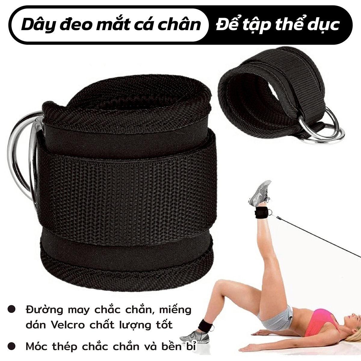 Dây đeo mắt cá chân tập thể dục có thể được sử dụng với hầu hết các hệ thống cáp tiêu chuẩn, huấn luyện viên chức năng và sức đề kháng, và các thiết bị tương tự để nối chân, uốn xoăn chân, bắt cóc hông và tập luyện mông.