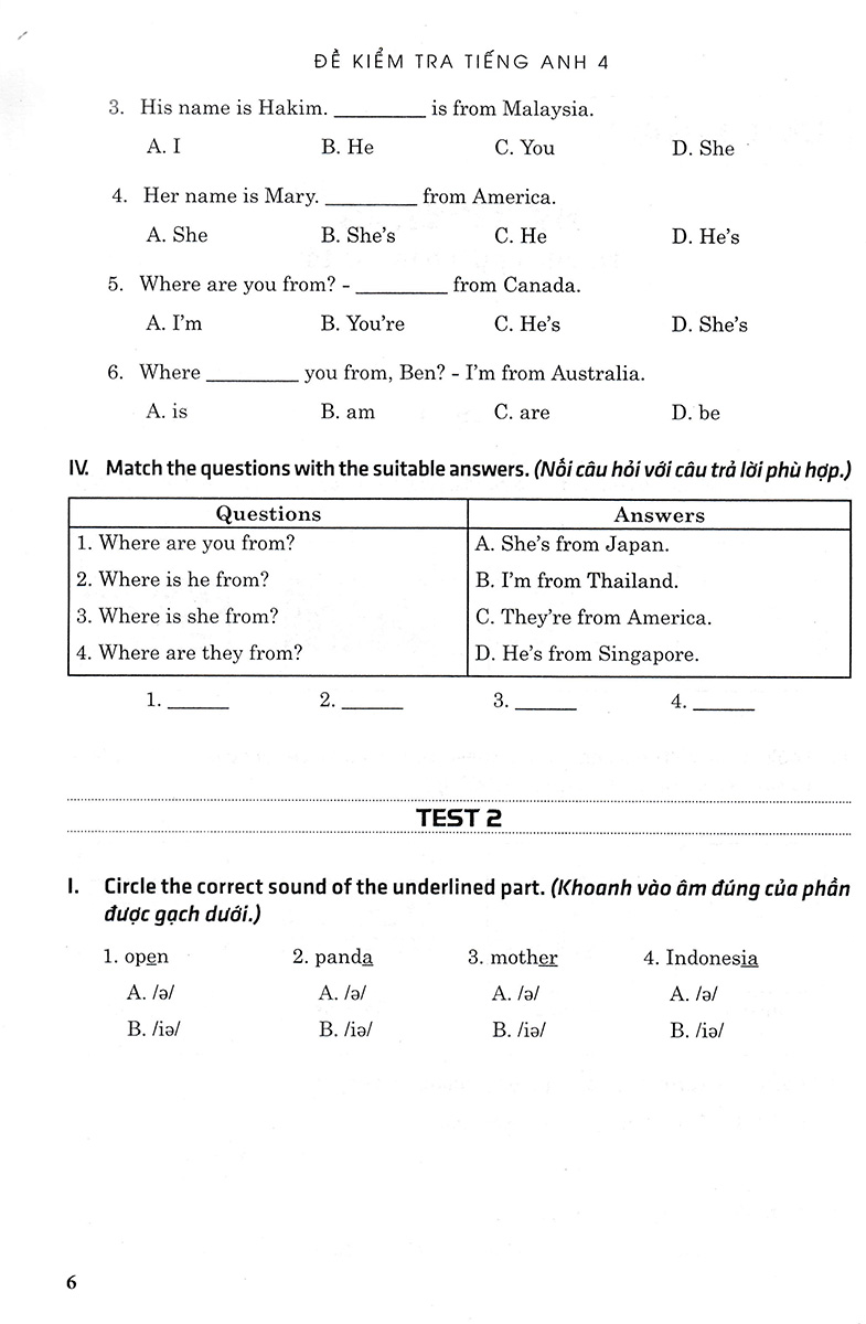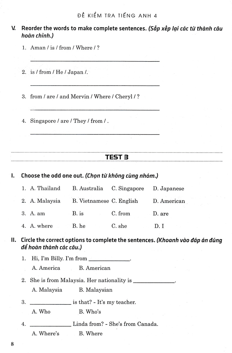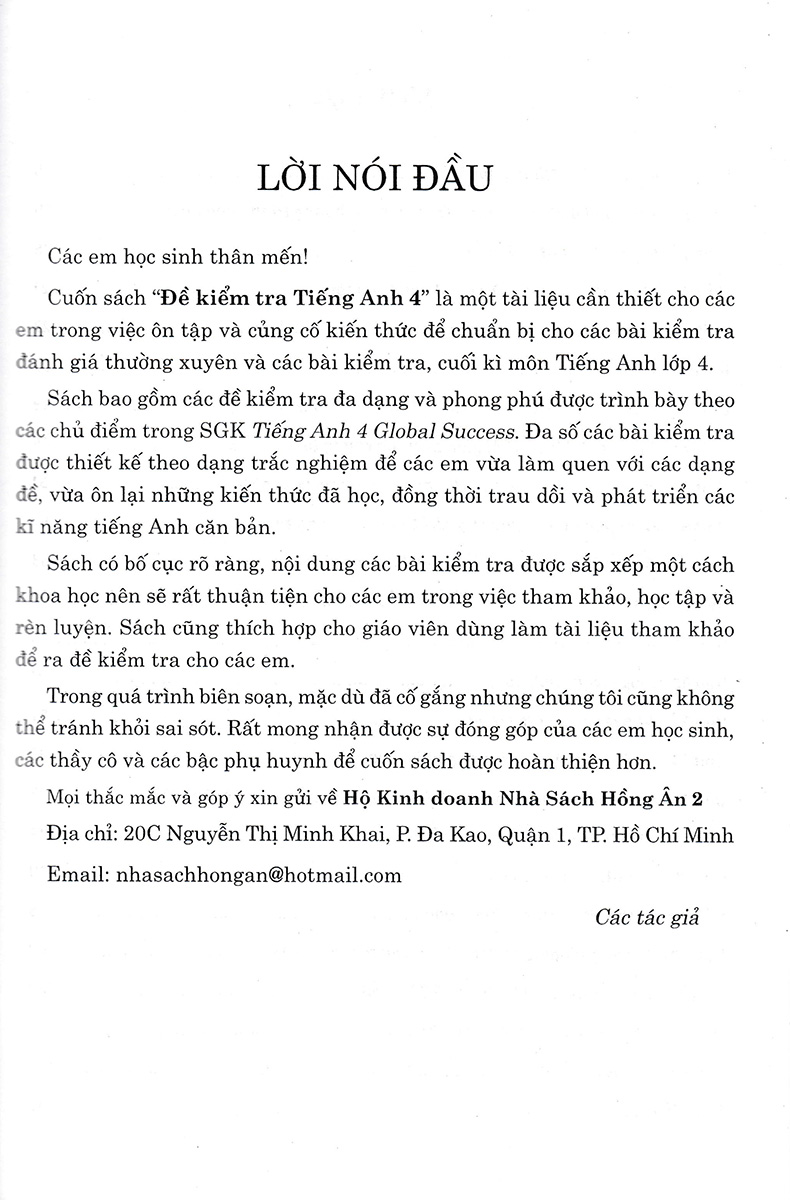 Cuốn sách “Đề kiểm tra Tiếng Anh 4” là một tài liệu cần thiết cho các em trong việc ôn tập và củng cố kiến thức để chuẩn bị cho các bài kiểm tra đánh giá thường xuyên và các bài kiểm tra, cuối kì môn Tiếng Anh lớp 4.