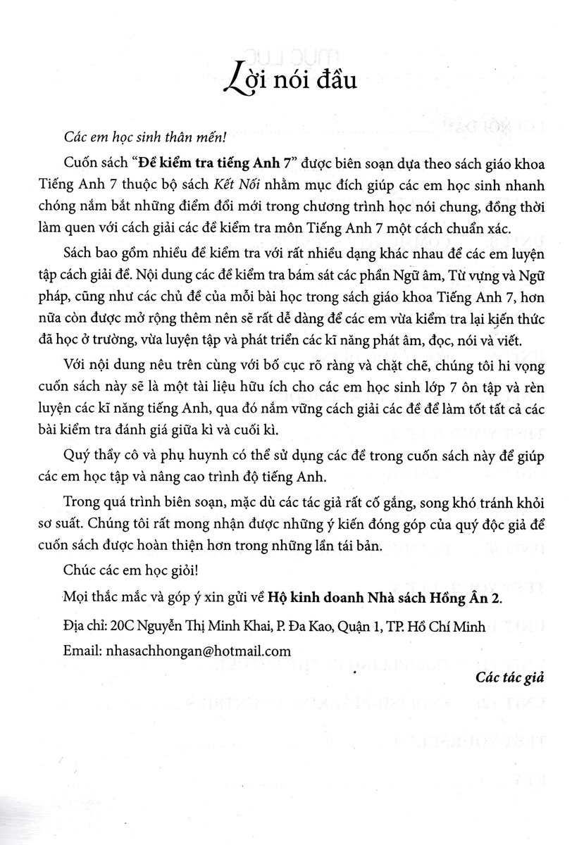 Với nội dung nêu trên cùng với bố cục rõ ràng và chặt chẽ, chúng tôi hi vọng cuốn sách này sẽ là một tài liệu hữu ích cho các em học sinh lớp 7 ôn tập và rèn luyện các kĩ năng tiếng Anh, qua đó nắm vững cách giải các đề để làm tốt tất cả các bài kiểm tra đánh giá giữa kì và cuối kì.