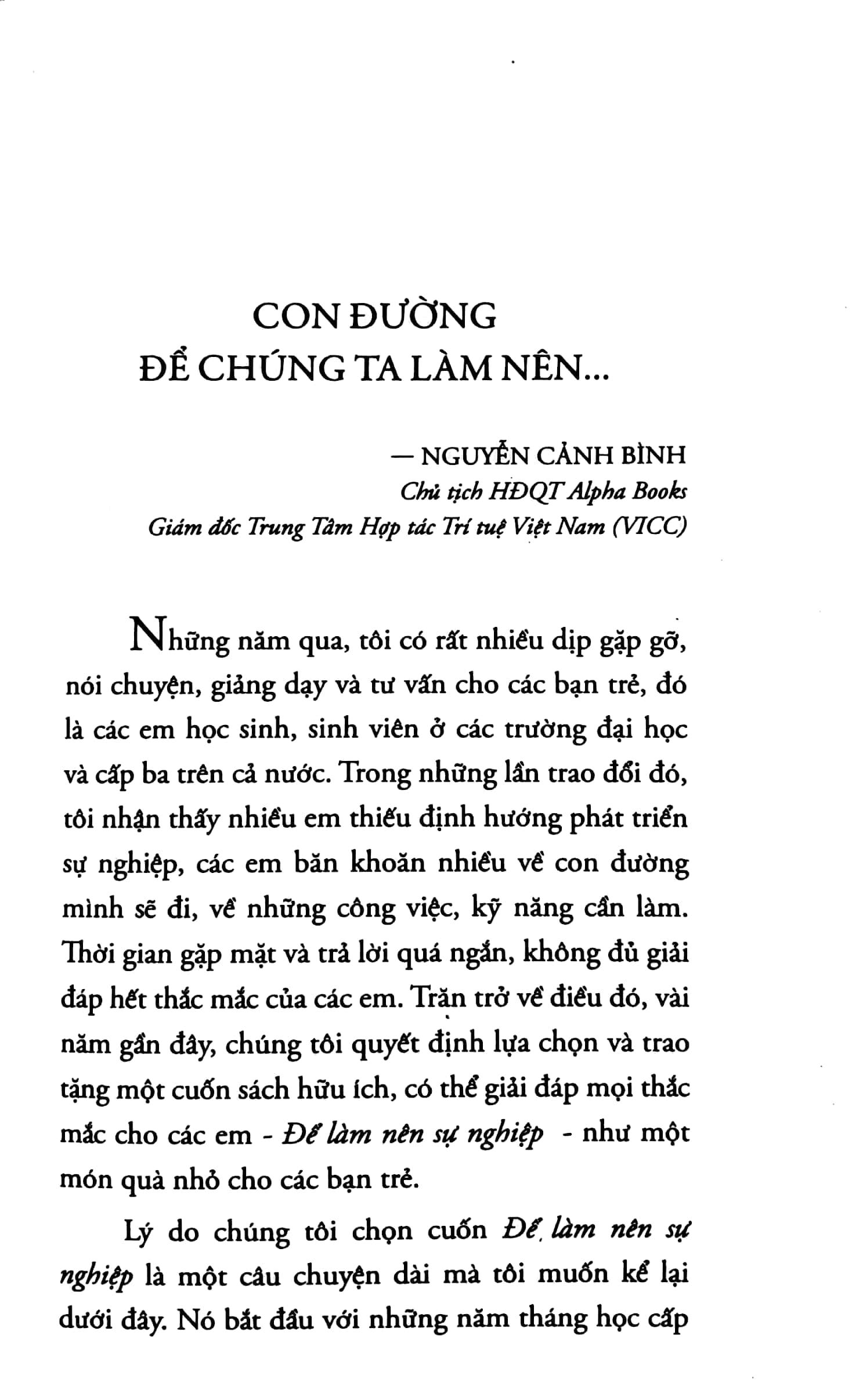 “Năm 1989, tôi bước chân vào giảng đường đại học. Cả một bầu trời tri thức, cả một thế giới với những điều mới lạ, cũng như đầy khó khăn mở ra trước mắt tôi. Tôi không còn là cậu học sinh phổ thông luôn làm theo những gì thầy cô giảng, mà thành công của tôi được quyết định bởi cách học và những gì tôi học. Học đại học có nghĩa là bạn phải biết cách tự học, nên học điều gì và bỏ qua cái gì. Đây là khoảng thời gian bắt đầu định hình tính cách, thói quen cũng như cá tính ở mỗi người. Thế nhưng, những năm tháng sinh viên đầu đời, hầu như không có sách nào nói cho tôi biết những điều đó. Có đến 99% những gì chúng tôi tiếp nhận được vào thời gian này chỉ là những lời khuyên một chiều. Không ai dạy cho chúng tôi những lời khuyên dạng như "thời giờ quý nhất trong đời là những giờ nhàn rỗi. Tương lai của anh tùy thuộc vào cách anh sử dụng thời gian nhàn rỗi ấy hơn là những gì anh làm trong giờ làm việc - Lời khuyên số 7". Tôi và những người bạn cứ mò mẫm, tự tìm cho m.ình những điều như vậy. Năm tháng sinh viên qua đi, tôi chập chững bước vào đời cùng với những biến chuyển vô cùng lớn lao của nền kinh tế xã hội. Kinh tế tư nhân xuất hiện, mọi người bắt đầu phải lo nghĩ đến chuyện kiếm tiền, cũng như m.ình sẽ làm gì trong cuộc sống. Trong những tháng ngày ngồi ở giảng đường, tôi không quá chú tâm vào việc học, thậm chí có thể nói là rất sao nhãng. Tôi đã không học như cách mọi người. Mặc dù không biết liệu cách học cũng như cách làm việc của m.ình có đúng hay không, nhưng tôi thấy nhiều điều phải học lại ít có giá trị. Những thông tin tôi thu lượm ở trường đại học không nhiều. Tôi không hình dung được những điều đó hữu ích như thế nào đối với tôi sau này. Năm 1995, tôi tình cờ mua cuốn sách Làm nên. Tôi đã mê mải đọc nó chỉ trong một ngày. Làm nên đã trở thành sách gối đầu giường của tôi thời đó. Tôi đã đọc được ở đây những lời khuyên vô cùng giá trị và hữu ích mà không thể tìm thấy ở bất cứ đâu. Đọc xong nó, tôi tự tin hơn với những suy nghĩ có phần "lệch lạc" so với lối suy nghĩ thông thường, so với những gì tôi thường được dạy. Tôi bắt đầu thay đổi cách dùng thời gian rảnh rỗi của m.ình. Tôi bớt đi cà phê, tụ tập với đám bạn mà tìm kiếm những việc hữu ích cho m.ình, đó là đọc sách và suy ngẫm, gặp gỡ những người giỏi hơn m.ình để trò chuyện, trao đổ