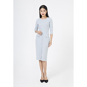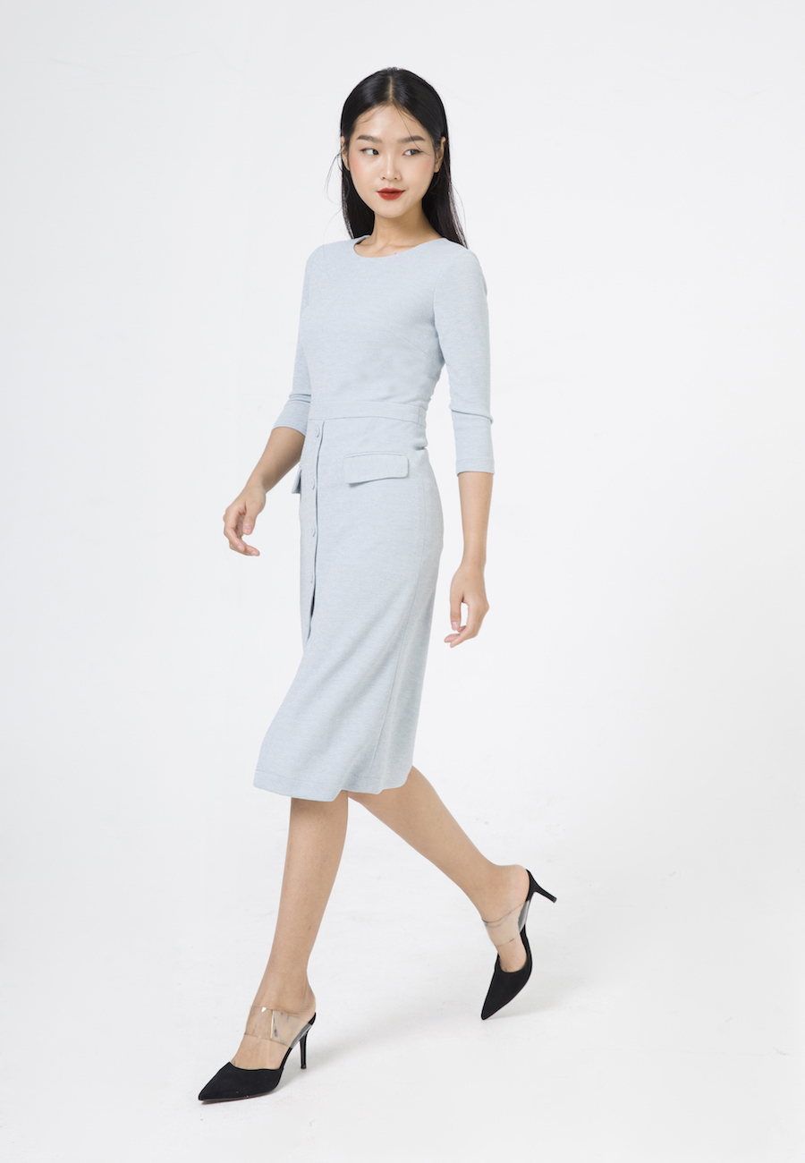- Đầm với hàng cúc giả thân trước, kéo khoá sau