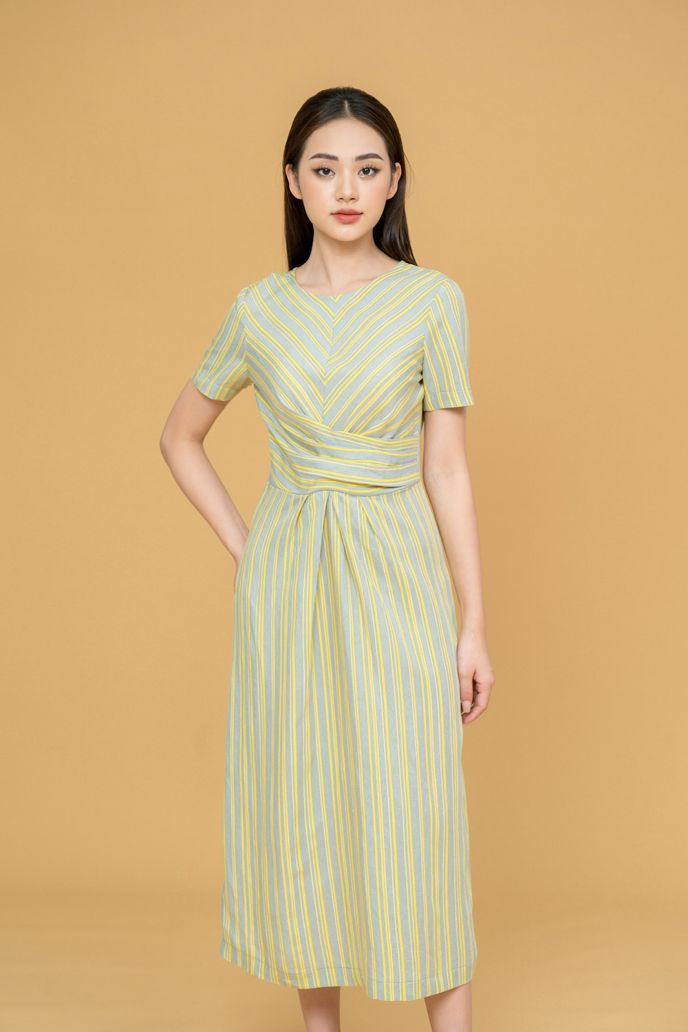 Đầm suông midi dáng dài, với vạt xoắn eo trẻ trung, cách điệu được cắt đối kẻ khéo léo, tinh tế. Chất liệu vải thô in hoạ tiết Hàn Quốc, mềm, mát. Tông mầu vàng