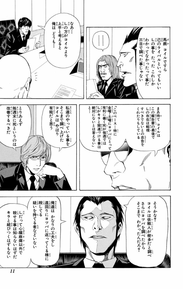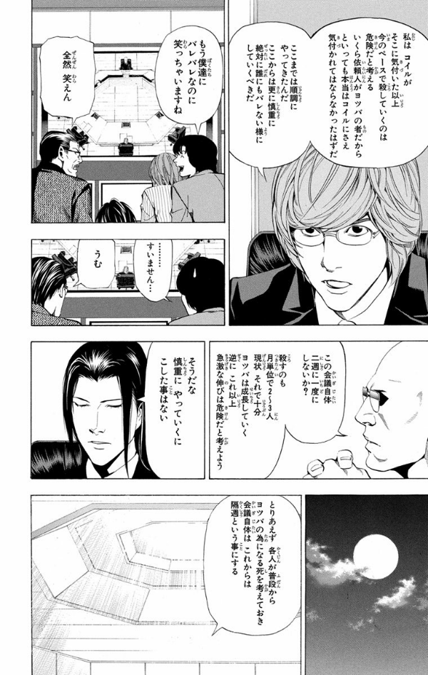ヨツバグループのあるメンバーの極秘会議を目撃しキラと繋がっている事を突き止めた月とLは、キラの真相を求めて、ミサをヨツバに潜入させる! 危険を承知で潜り込んだミサに接触してきたのは!? そして…!?
