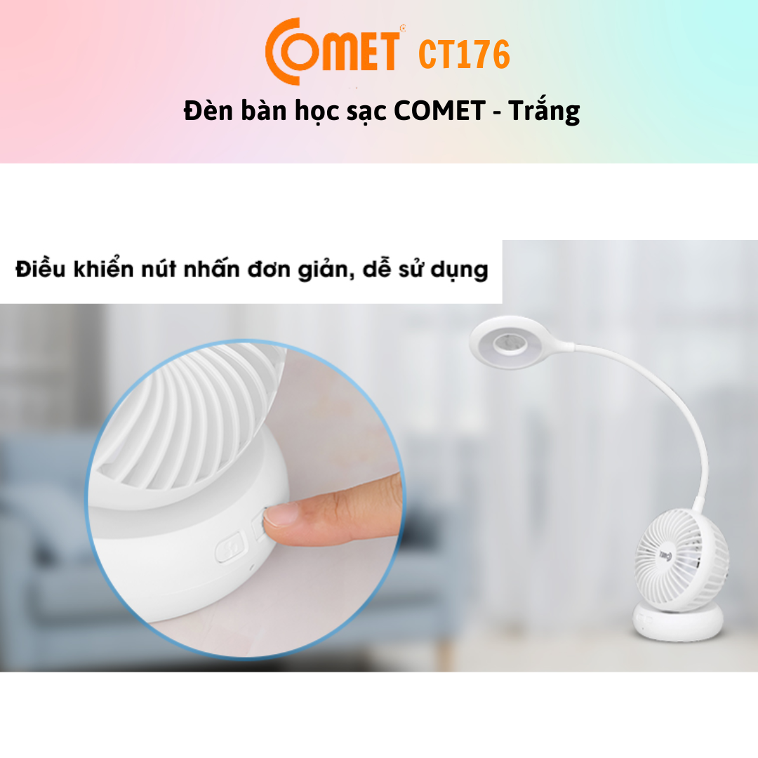- Đèn Bàn + Đèn Sạc 2 Trong 1 LED COMET CT176 rất phù hợp để dành cho bé yêu nhà bạn, vừa học bài, vừa có quạt mát, mà không còn lệ thuộc vào việc nhà mất điện