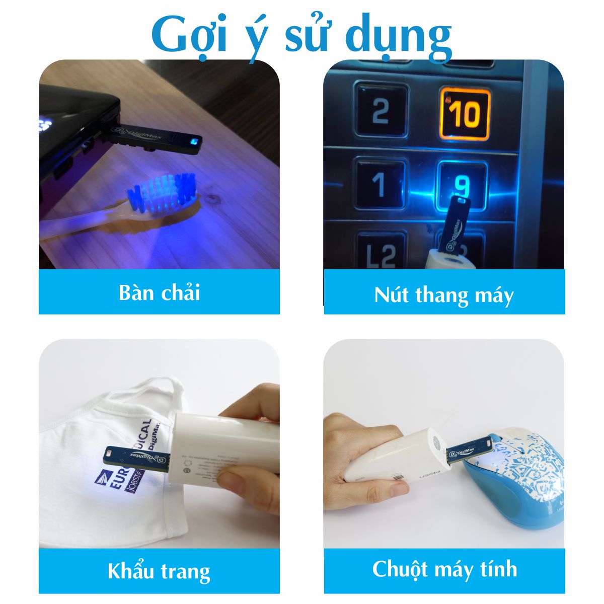 - Sử dụng đèn DP-3R1 bằng nguồn sạc di động, loại bỏ vi khuẩn và bụi bẩn trên khẩu trang (khuyến cáo chỉ nên diệt khuẩn và tái sử dụng khẩu trang y tế tối đa 3 lần).