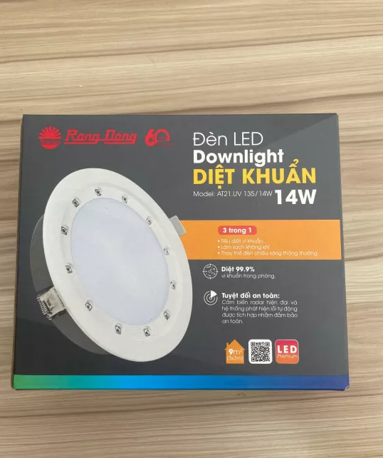 Đèn LED Âm trần Downlight UV 135/14W Model: AT21.UV 135/14W Công suất:14W Điện áp:220V/50Hz Nhiệt độ màu:6500K Quang thông:1000lm Góc phát hiện rada:90 độ Chiều cao lắp đặt:(2.8-3.5)m Kích thước (ØxH):(149x51)mm ĐK lỗ khoét trần:135mm