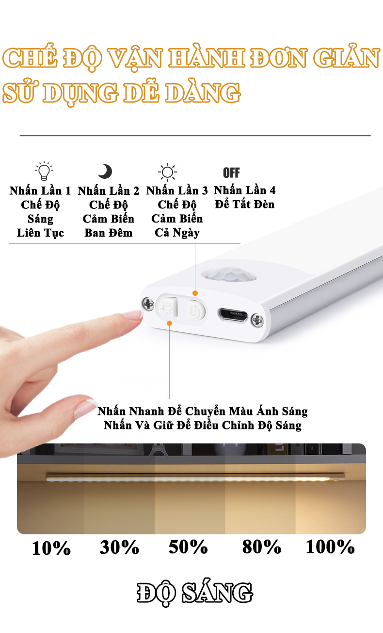 - Dễ dàng điều chỉnh cường độ sáng tùy thích bằng cách nhấn và giữ nút chỉnh màu sáng: 10% - 30% - 50% - 80% - 100% Ánh sáng dịu và dễ chịu, không bị chói khi nhìn trực tiếp.
