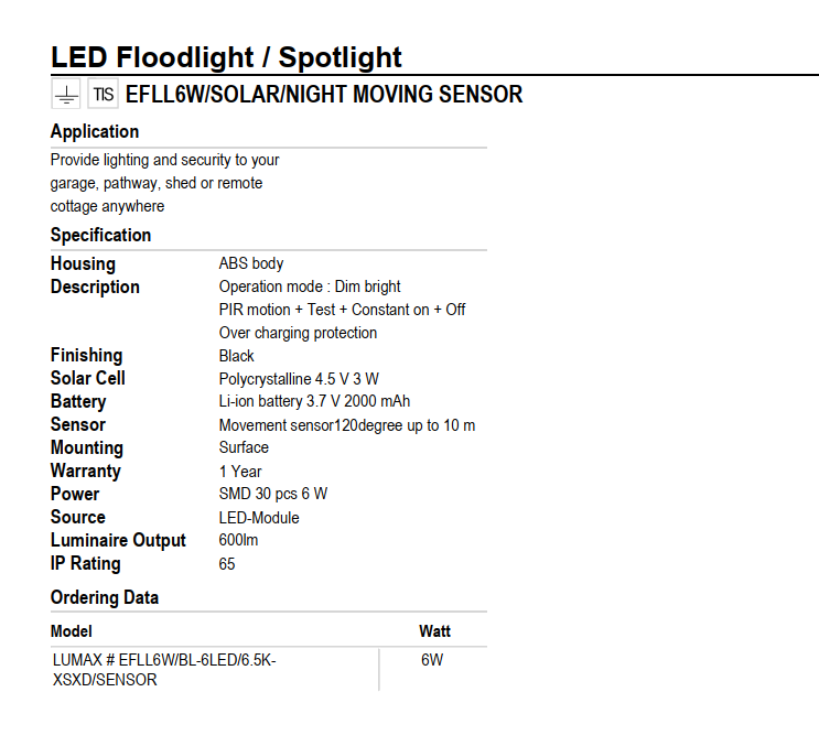 - Thành lập văn phòng đại diện tại HCM từ năm 2005 tới 2017, thành lập công ty TNHH Lighting & Equipment ( Việt Nam) tại Biên Hòa – Đồng Nai chuyên cung cấp thiết bị chiếu sáng và các giải pháp hỗ trợ ánh sáng Thương hiệu: L&E và LUMAX Thương hiệu đạt tiêu chuẩn chất lượng, phát triển trên toàn khu vực Châu Á nói riêng và đang mở rộng thị trường trên toàn thế giới. Các dòng sản phẩm được Nhập khẩu và Phân phối chính hãng tại thị trường Việt Nam, đáp ứng các tiêu chuẩn an toàn Quốc tế mang lại sự tin cậy cho người dùng Đèn pha năng lượng mặt trời cung cấp ánh sáng và bảo vệ cho nhà để xe, lối đi, nhà kho hoặc ngôi nhà hẻo lánh của bạn ở bất cứ đâu THÔNG SỐ KỸ THUẬT