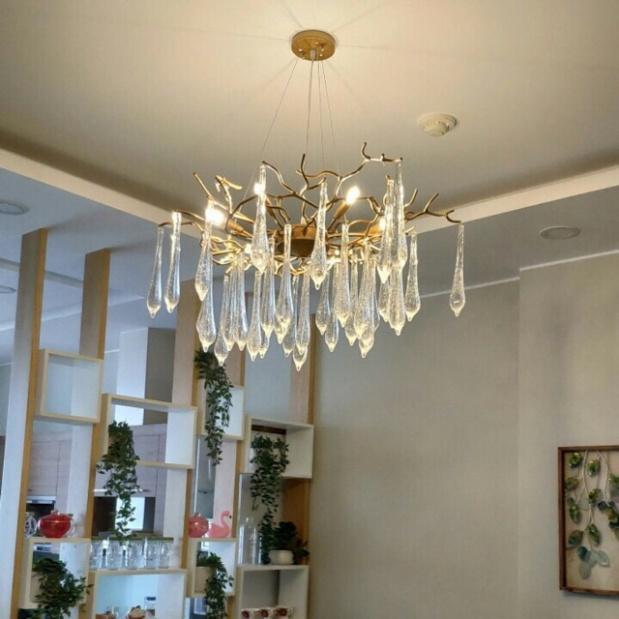 Chất liệu: đế là kim khí mạ vang,thân đèn là kim loại tổng hợp nhôm mạ vang phối hợp với những thanh phale hình giọt nước chuẩn K9