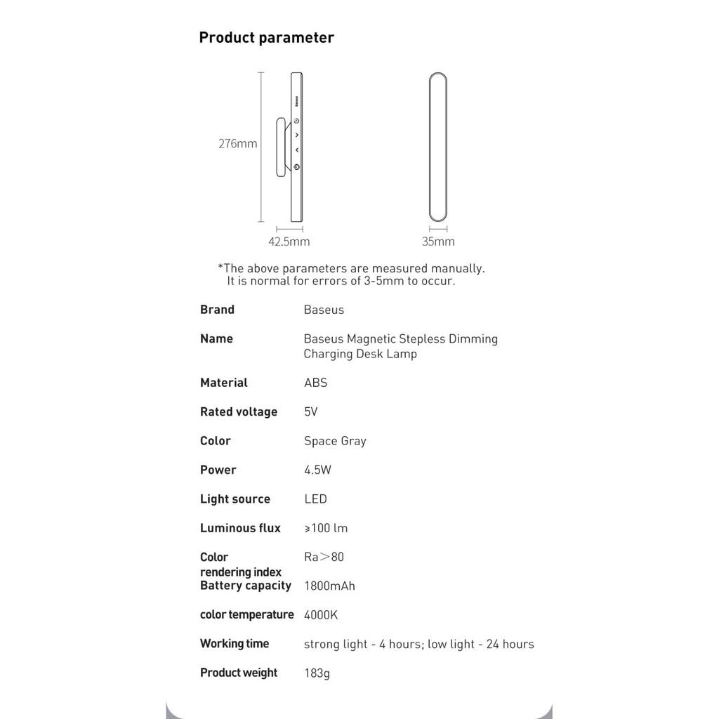 Thông số sản phẩm: Thương hiệu: Baseus Mã quốc tế: DGXC-C0G Tên tiếng anh: aseus Magnetic Stepless Dimming Charging Desk Lamp Chất liệu: ABS Dung lượng: 1800 mAh Nhiệt độ màu: 4000K Thời gian làm