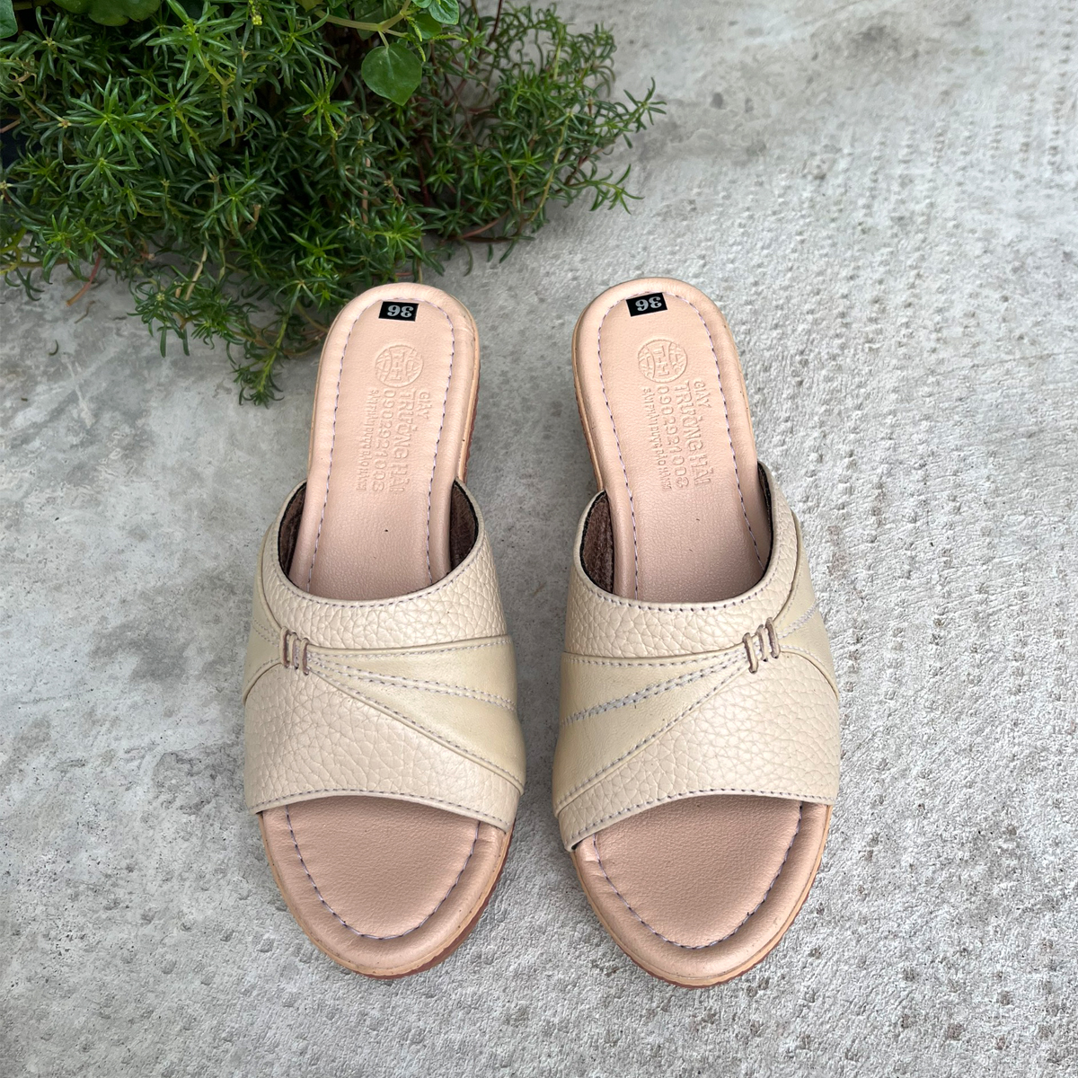 ✨Dép nữ quai ngang đế xuông da bò cao 7.5cm Trường Hải 2 màu đen, kem D145N