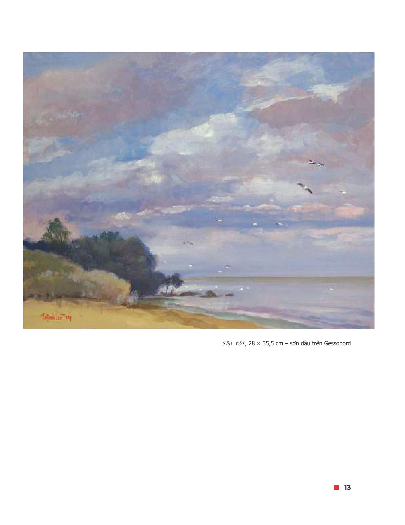 “Càng xem tranh ông, đọc các ghi chép đi vẽ hằng ngày của ông, người mê tranh mê chữ như được đồng thỏa niềm khát. Bảng màu của ông dung dị mà sang trọng, bút pháp hàn lâm, thâm hậu, ấn tượng và biểu cảm. Giọng văn ông gần9 gũi, nhẹ nhàng, giàu thi tính, khiến người đọc thấy như đang được rong ruổi xe đạp cùng ông, dựng giá vẽ bên lối mòn trong rừng hay ngồi phệt xuống đâu đó bên vệ cỏ một chiều ẩm ướt, nghe ông thủ thỉ chuyện đời trong khi chứng kiến những nét thiên nhiên hiện dần lên dưới tay bút kỳ tài. Tranh ông vẽ đất khách người dưng mà sao không thấy xa lạ cảnh sắc hay cách trở nhân tình. Thế giới phẳng bây giờ đâu cũng là nhà chăng? Bài ký nào, bức họa nào cũng mộc như cái tình chân thành của người nghệ sĩ yêu đất, yêu trời, yêu đời, yêu người, rủ rỉ một m.ình, mà sao khiến người đọc dễ lây đến thế cái an nhiên tự tại.” (Phạm Long, tr. 8-9)