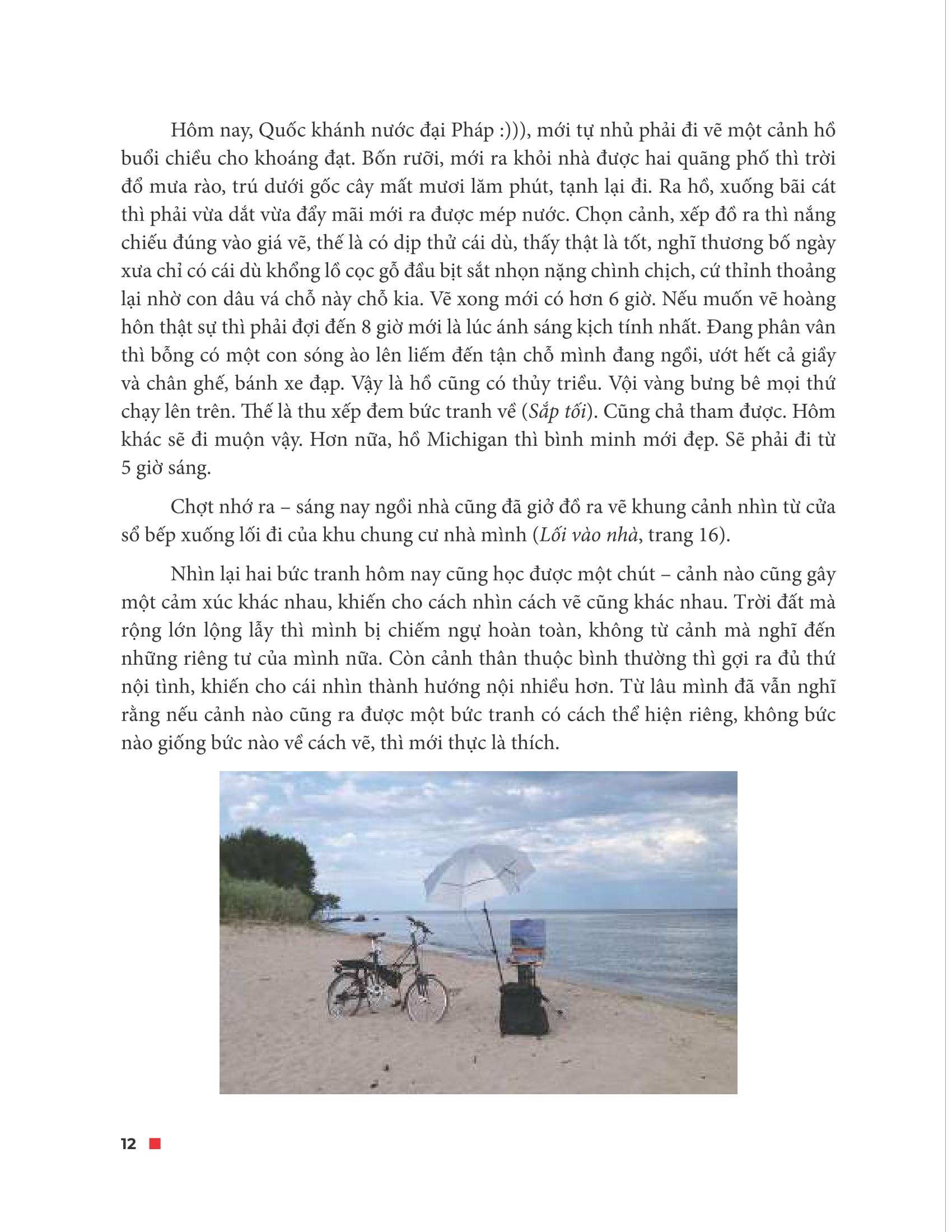 Chiều nay nhận ra một điều: nhìn chưa chắc đã thấy, và thấy chưa chắc đã nhận ra. Đi vẽ phong cảnh thì có nghĩa là không phải cứ nhìn là thấy cảnh muốn vẽ; và thấy cảnh muốn vẽ chưa chắc đã nhận ra cái mà m.ình cảm thấy muốn vẽ ấy thực sự là cái gì. Chỉ khi nhận ra cái thực sự thôi thúc m.ình vẽ thì mới có được bức tranh thuyết phục được chính m.ình và người xem. (tr. 38)