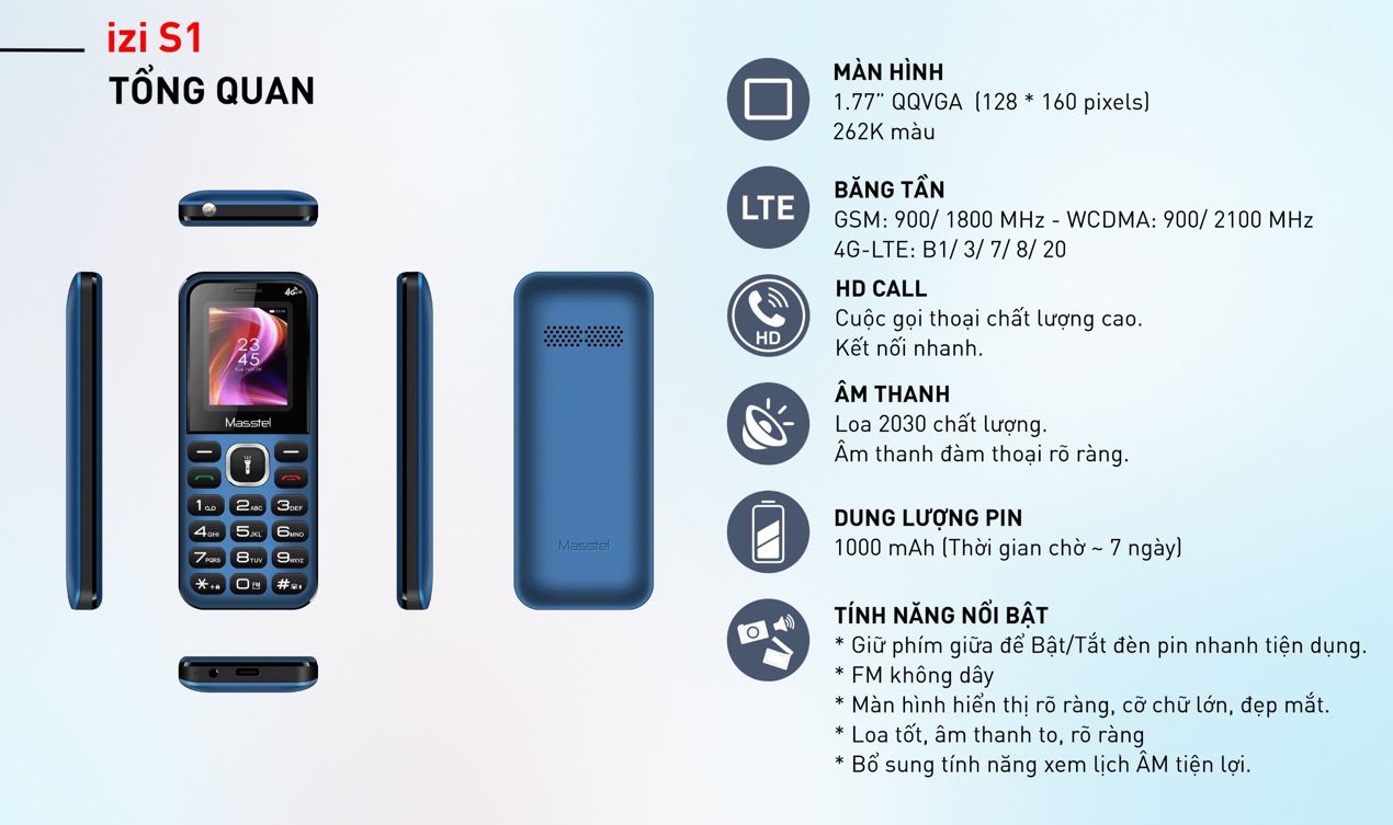 Thắng Thao Mobile cam kết Máy chuẩn 4G không lo cắt sóng 2G Hàng chính hãng mới 100% Bảo hành 12 tháng TÍNH NĂNG NỔI BẬT Masstel IZI S1 4G, một chiếc điện thoại phổ