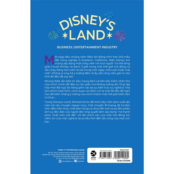 Với cuốn sách này, chuyên gia viết chuyện sử Richard Snow đưa người đọc đi qua quá trình nung nấu ý tưởng của Disney cho Disneyland, một công viên giải trí sáng tạo hơn bất kỳ công viên giải trí nào vào thời điểm đó. Với cuốn sách Disney's Land, Richard Snow trình bày một cách xuất sắc toàn bộ câu chuyện ngoạn mục, một chuyến đi hoang dã từ tầm nhìn đến hiện thực, một bản hùng ca về sự đổi mới và sai lầm phản ánh sự độc đáo của người đàn ông quyết tâm xây dựng “nơi hạnh phúc nhất trên trái đất” với độ chính xác của một thợ đồng hồ, niềm tin của một nghệ sĩ và sự liều lĩnh đến tột cùng của một con bạc.