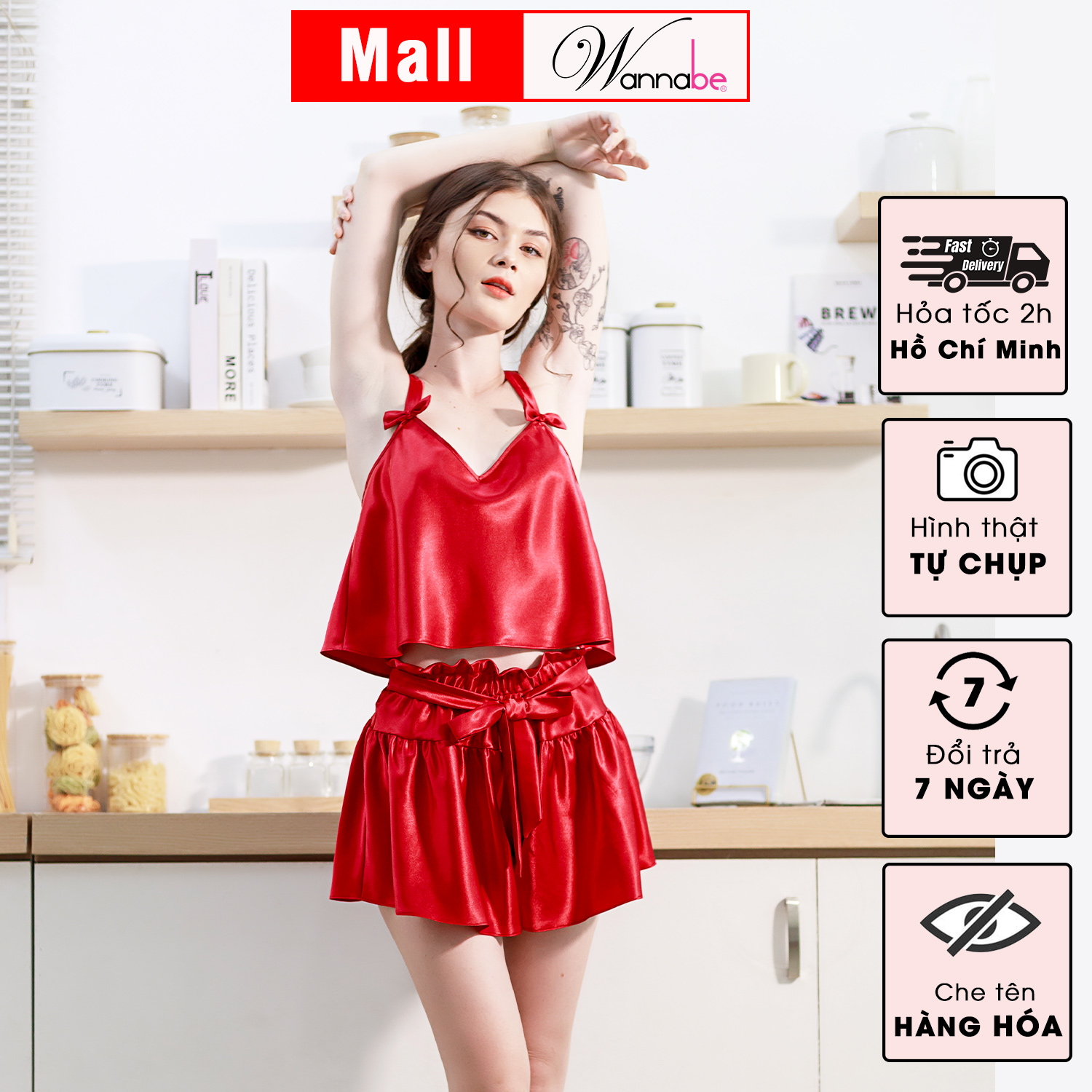 Đồ bộ mặc phi lụa cao cấp WANNABE BSS38 bộ sọt 2 dây cúp 2 lớp tạo độ phồng cúp ngực nữ tính trẻ trung năng động Đồ bộ mặc nhà phi lụa cao cấp