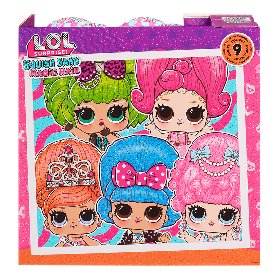 Bạn có thể bẻ và bóp để mở Squish Sand! Đặt búp bê của bạn vào khuôn cùng với cát để tạo kiểu tóc Squish Sand hoàn toàn mới có thể tồn tại trong 3-4 phút. Lấy quả bóng LOL Bất ngờ của bạn nén cát lại để tạo ra các họa tiết vui nhộn. Bạn có thể chạm vào hoặc dùng lược để tạo các hình dạng lượn sóng.