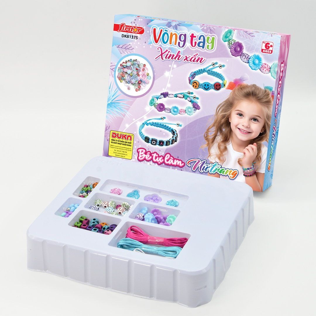 Bộ đồ chơi Bé tự làm nữ trang - Lắc tay dễ thương được thiết kế các chi tiết mô phỏng các đồ vật trang sức đầy màu sắc cho bé như hạt cườm nhiều hình dạng ngộ nghĩnh, giúp bé có thể tự do sáng tạo cho mình những chiếc lắc tay xinh xắn mang phong cách và cá tính riêng biệt.  Bộ đồ chơi giúp bé rèn luyện các kỹ năng như: Phát triển tư duy thẩm mỹ, rèn kỹ năng đôi tay khéo léo, nhận biết màu sắc, kết nối cộng đồng và định hướng nghề nghiệp trong tương lai.  Với chất liệu nhựa ABS an toàn, bộ đồ chơi sẽ là món quà đáng giá mà các cha mẹ dành tặng cho con mình sau những giờ học tập căng thẳng.  Thông tin sản phẩm : Thương hiệu :  DUKA Xuất xứ thương hiệu : Việt Nam Độ tuổi: trên 6 tuổi Thành phần: Nhựa ABS an toàn cho trẻ Thông số kỹ thuật : sản phẩm không dùng pin Kích thước hộp: 23 cm x 22.8 cm x 4.3 cm Sản xuất tại : Trung Quốc Năm sản xuất: 2025 Quy chuẩn quốc gia về đồ chơi trẻ em QCVN 3:2019/BKHCN. Số chứng minh hợp lệ :VIC/25.HQ/9.01.0512, cấp ngày 21/05/2025. Hướng dẫn sử dụng:  A. Xâu chuỗi và tự do sáng tạo hoặc theo các hình mẫu in trên bìa hộp sản phẩm.   Cảnh báo an toàn: Sản phẩm dùng cho trẻ em Màu sắc và sản phẩm có thể thay đổi theo sản phẩm thật