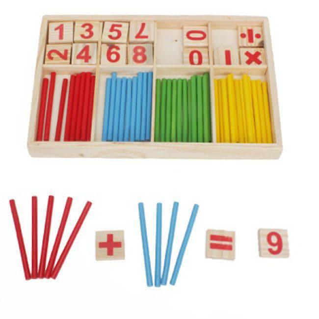 - Bao gồm: 24 ô vuông nhỏ in số số từ 0 đến 9 và các dấu cộng, trừ, nhân, chia, bằng; 04 ô đựng các que tính nhiều màu sắc - mỗi ô gồm 13 que tính.