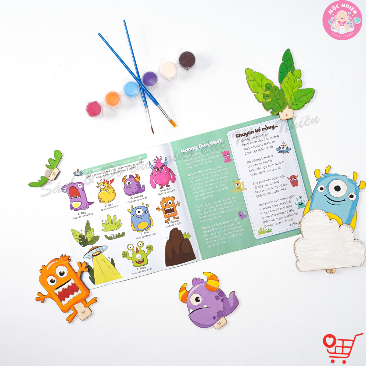 - Mỗi chủ đề gồm có: 12 đến 18 chi tiết gỗ chưa tô màu. 1 khay nhựa pha màu. 1 truyện - thơ sáng tạo theo chủ đề. 12 màu acrylic. 1 Bảng hướng dẫn pha màu mini. 2 cọ vẽ. Chất liệu: