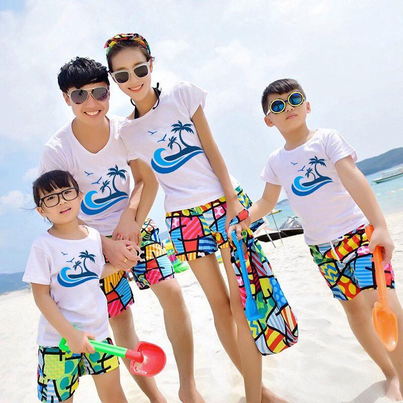 - ĐỒ ĐI BIỂN, DÃ NGOẠI Happy Holidays dành cho gia đình ( giá 1 bộ gồm 1 quần + 1 áo) CHẤT LIỆU : Quần vải dù nhanh khô, chống bám cát, không co