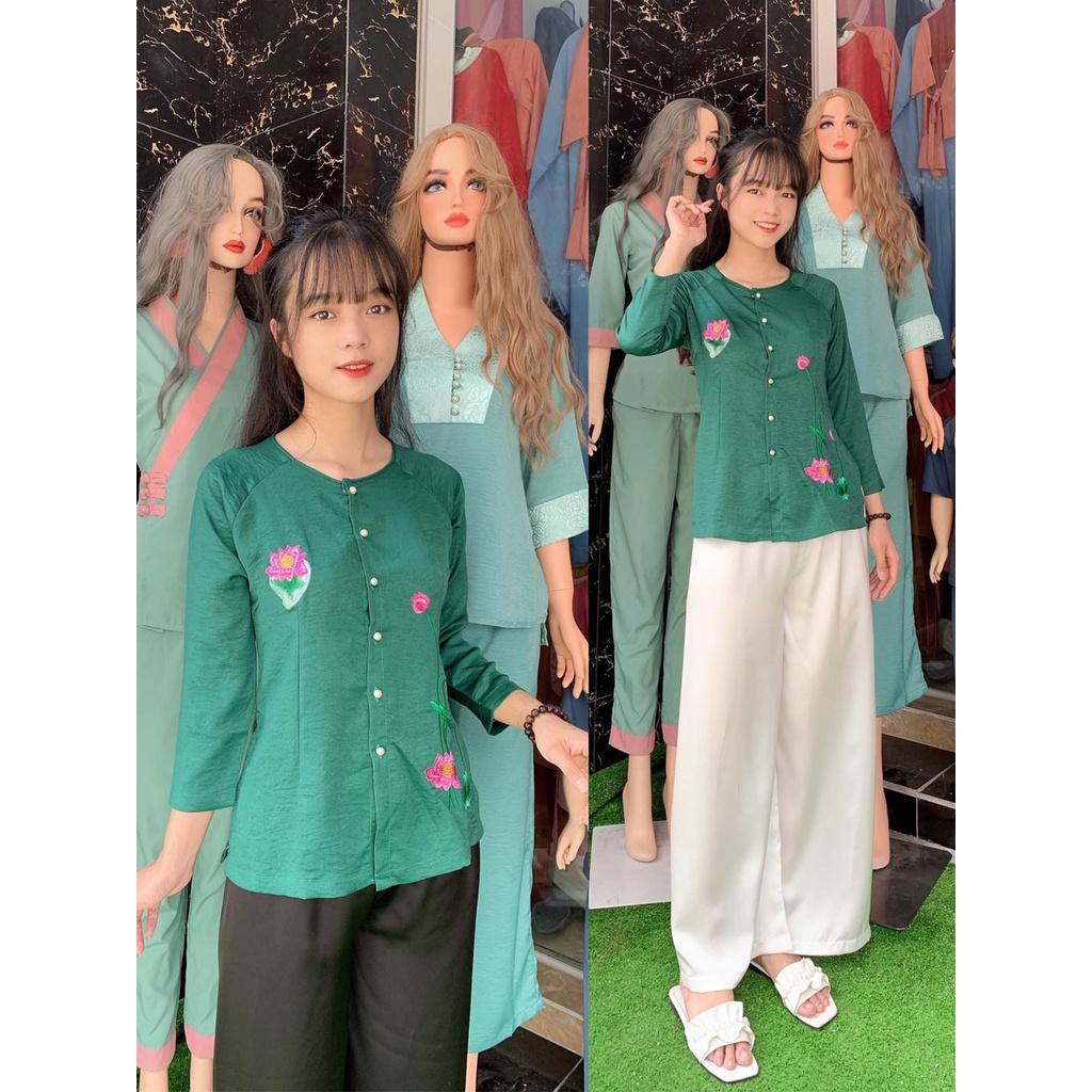 Đồ lam đi chùa - áo xống đi chùa - Đồ lam phật tử - Bộ đồ đi lễ chùa thêu sen cổ tàu (Ảnh + Video cửa hàng tự quay)