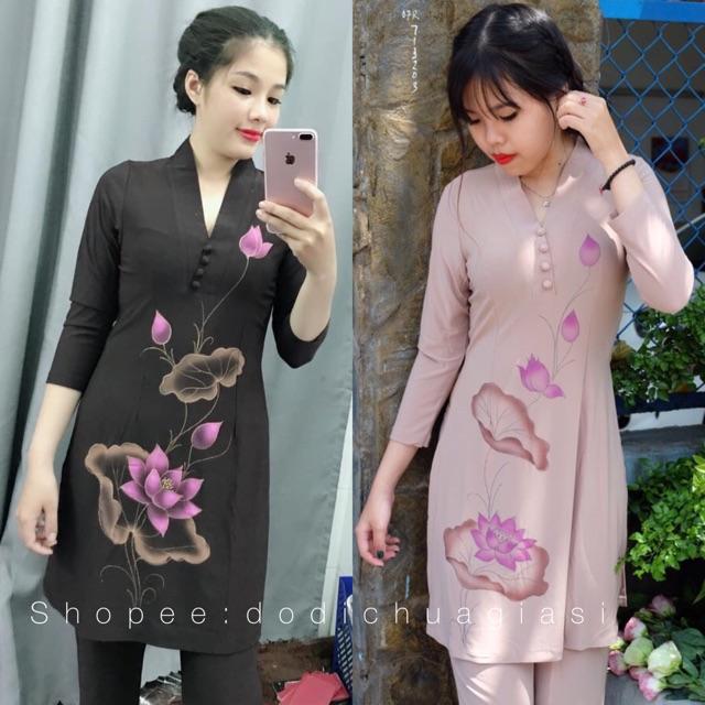 Bộ Áo dài cách tân đi chùa thêu họa tiết hoa sen. Mã sp CTDC 01