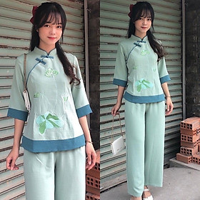 Đồ lam đi chùa - áo xống đi chùa - Đồ lam phật tử - Bộ đồ đi lễ chùa thêu sen cổ tàu (Ảnh + Video cửa hàng tự quay) Bộ đồ lam phật