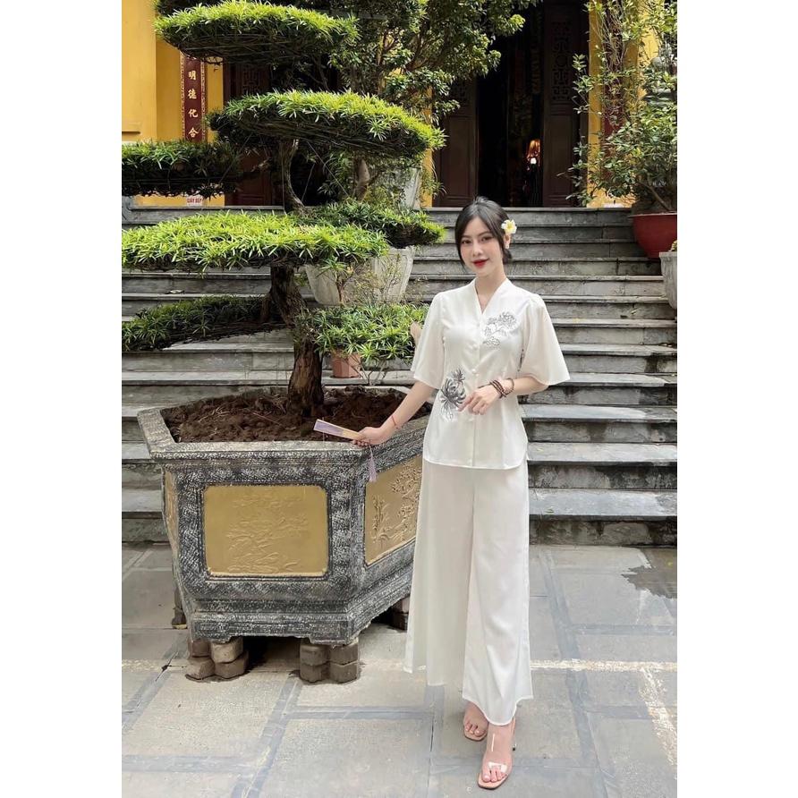 Quần áo đi chùa - Bộ thêu hoa 3D màu trắng - Tâm An Store