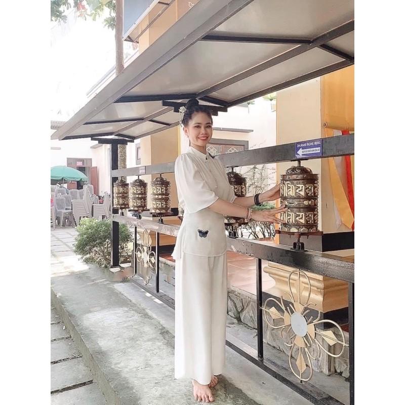 Mẫu pháp phục nữ - quần áo Phật tử đi chùa, đồ lam chất kate lụa mềm có co giãn Sen Hồng 0898553583