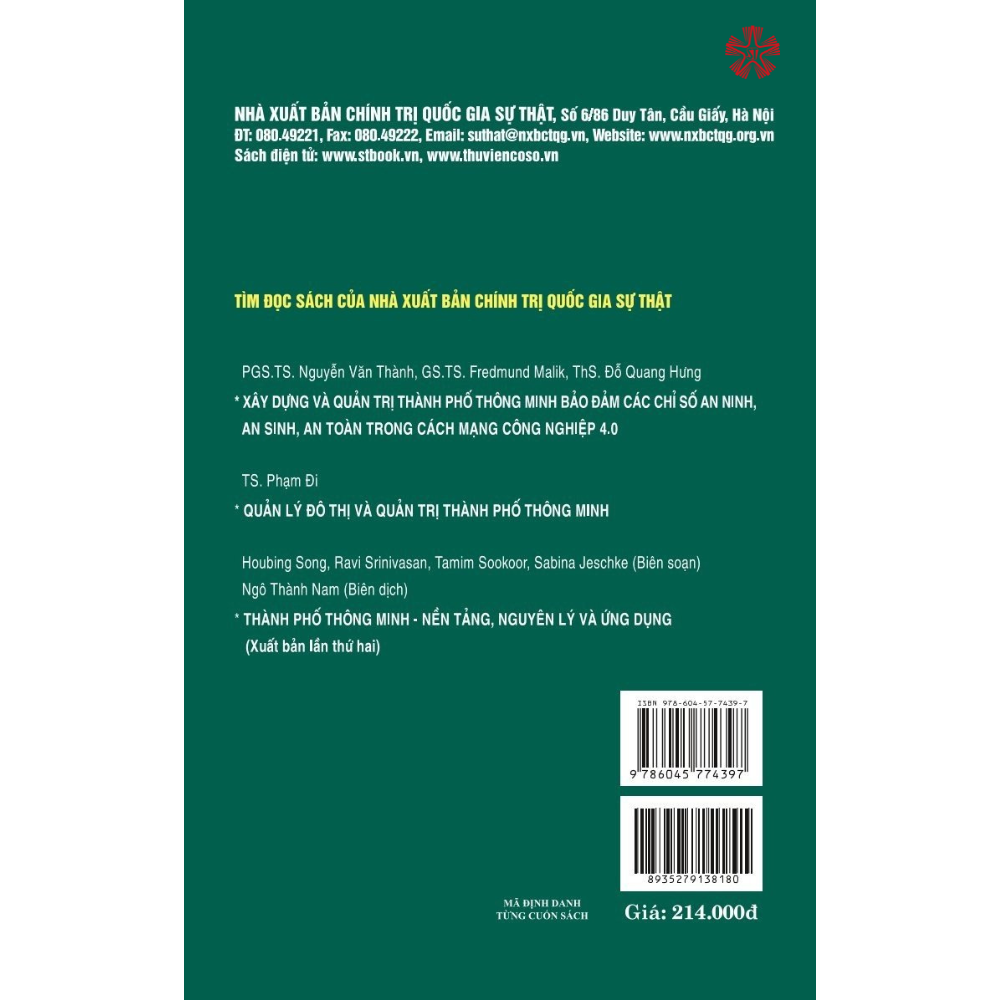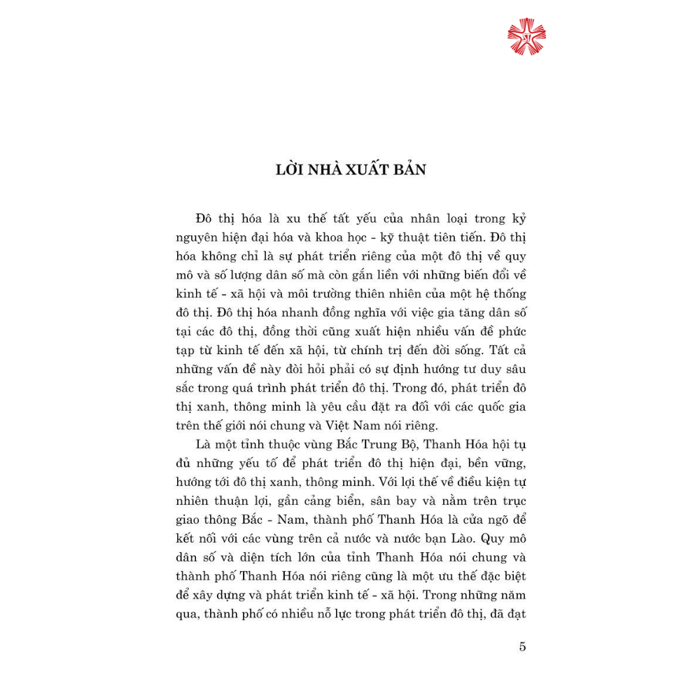 Cuốn sách Đô thị xanh, thông minh (từ thực tiễn thành phố Thanh Hóa), góp phần cung cấp tài liệu tham khảo cho bạn đọc tìm hiểu về vấn đề xây dựng đô thị xanh, thông minh từ thực tiễn thành phố Thanh Hóa. Nội dung cuốn sách hệ thống hóa các vấn đề liên quan đến đô thị, cơ sở khoa học và kinh nghiệm thực tiễn về phát triển thành phố hiện đại, bền vững, hướng tới đô thị xanh, thông minh, phân tích thực trạng phát triển của thành phố Thanh Hóa, đồng thời đưa ra định hướng và giải pháp phát triển thành phố Thanh Hóa hiện đại, bền vững, hướng tới đô thị xanh, thông minh.