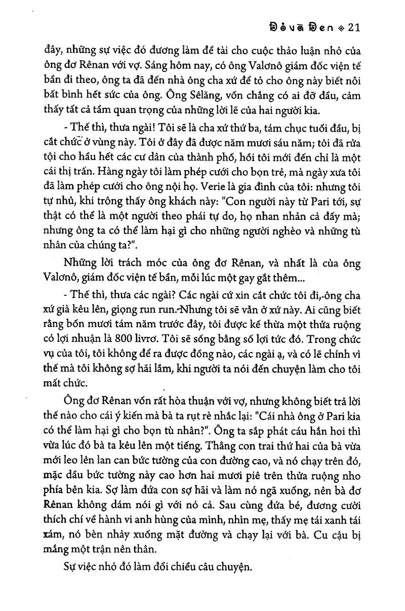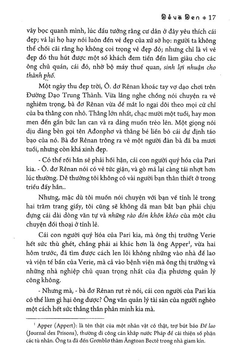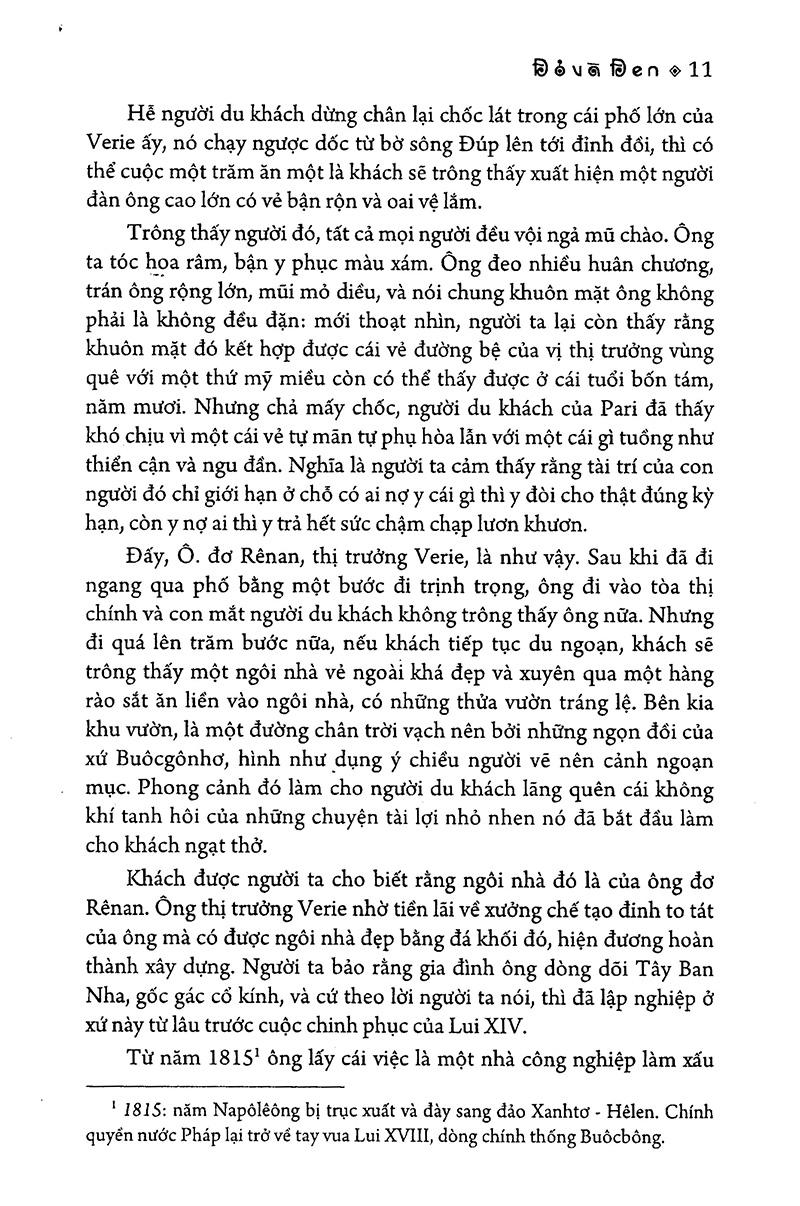 Vai chính trong câu chuyện, Julien Sorel, là một người đàn ông thông minh và có nghị lực, anh nuôi dưỡng những ảo tưởng lãng mạn và trở thành con tốt đen cho các mưu đồ chính trị của những người có quyền lực sống quanh mình.