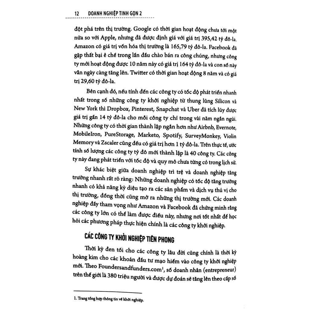 Doanh nghiệp tinh gọn 2 trình bày một thiết kế đột phá nhằm cách mạng hóa các tổ chức lớn, dựa trên các nguyên lý và thực tiễn được cộng đồng khởi nghiệp tán thành, đồng thời giải thích cách để tạo ra một loạt các ý tưởng về sản phẩm hoặc dịch vụ và tìm ra yếu tố quyết định giúp công việc kinh doanh có triển vọng và ổn định trên quy mô của một công ty lớn. Cuốn sách cung cấp cho bạn: