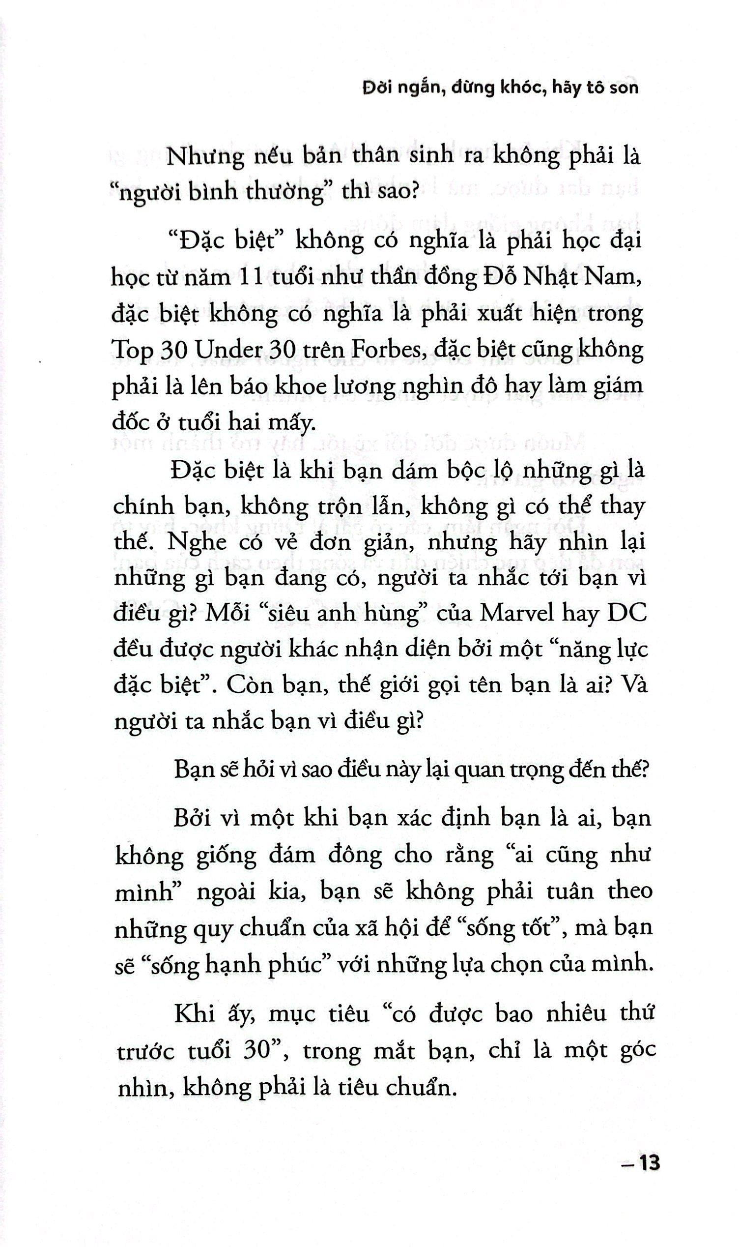 - Tại sao không phải là sống hạnh phúc với số tiền vừa đủ? Vô vàn những câu hỏi đặt ra dành cho những ai đi bước vào tuổi trẻ. Không còn đơn giản là những câu hỏi ai-cũng-hỏi, chẳng biết tự bao giờ trở thành những quy chuẩn của xã hội áp lên những con người đang sống trong đó. Một khi bạn xác định bạn là ai, bạn không giống đám đông cho rằng “ai cũng như m.ình” ngoài kia, bạn sẽ không phải tuân theo những quy chuẩn của xã hội để “sống tốt”, mà bạn sẽ “sống hạnh phúc” với những lựa chọn của m.ình. Khi ấy, mục tiêu “có được bao nhiêu thứ trước tuổi 30”, trong mắt bạn, chỉ là một góc nhìn, không phải là tiêu chuẩn. Khi ấy, hạnh phúc không phải là những gì bạn đạt được, mà là những gì bạn lựa chọn, bởi bạn không giống đám đông. Muốn thật sự hạnh phúc, hãy học cách yêu thương bản thân m.ình để có thể đi xa trên đường đời. Trước khi có thể lo cho người khác, hãy tự biết cách giải quyết vấn đề của m.ình. Muốn được đời đối xử tốt, hãy trở thành một người có giá trị, bạn nhé! Đời ngắn lắm, các cô gái à! Đừng khóc, hãy tô son để tiếp tục chiến đấu và sống theo cách của bạn. Cuốn sách này không chỉ dành riêng cho phụ nữ, mà còn dành cho những ai đang khao khát tìm lại vẻ đẹp trong chính tâm hồn m.ình. Những "triết lý" đời thường truyền cảm hứng cho người đọc biết sống vì m.ình và chăm sóc tốt cho bản thân.