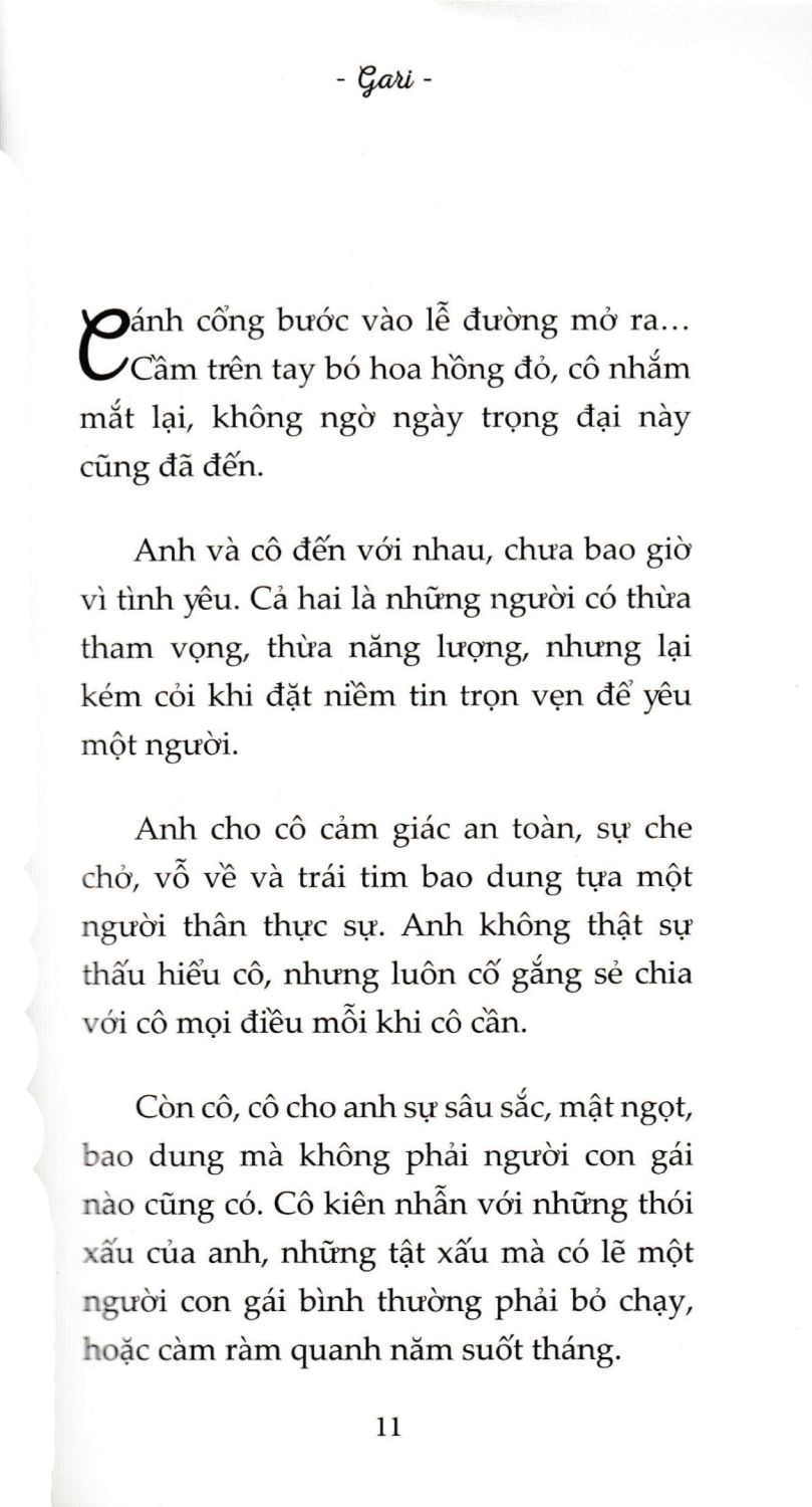 Gari được biết tới là một tác giả viết rất nhiều về “tình yêu”, trong Đời Vô Thường Ta Nợ Nhau Chữ Thương tình yêu vẫn là một sợi chỉ chạy xuyên suốt cả cuốn sách. Nhưng ta được tiếp cận với tình yêu ở dưới nhiều hình thái hơn, với nhiều xúc cảm và suy ngẫm hơn. Gari có nói: “Tình cảm là thứ dễ vơi nhất, và cũng là thứ đắt giá nhất trên đời.” Tình cảm cũng vô thường, chúng ta không biết ngày mai chuyện gì sẽ xảy ra, có lẽ, điều tuyệt vời nhất mà mỗi người có thể làm cho nhau là trân trọng và biết ơn sự hiện diện của người kia trong cuộc sống, trong hôm nay, trong hiện tại, trong lúc này….