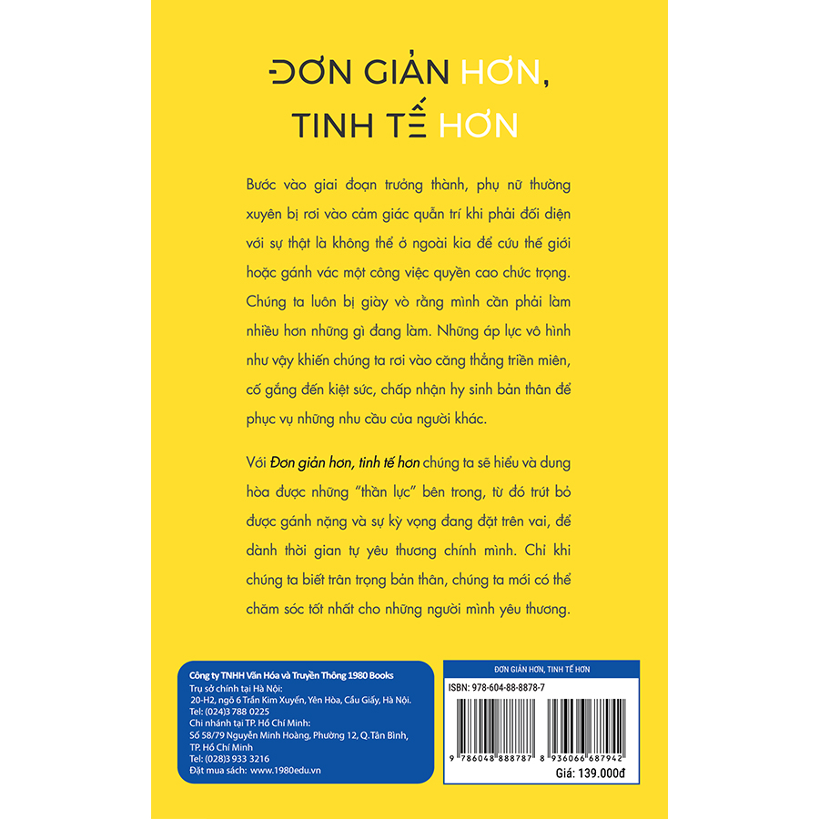 Cuốn sách “Đơn giản hơn, tinh tế hơn” chính là món quà mà tác giả Kate Northrup mang đến để giúp chúng ta giải phóng những gánh nặng, những sự kỳ vọng đang đặt lên vai, từ đó dành sự ưu tiên cho bản thân trong việc tự chăm sóc, tự trân trọng, và quan trọng hơn hết là tự yêu thương chính mình. Chỉ khi chúng ta bắt đầu dung hòa được những “thần lực” bên trong, chúng ta mới có thể chăm sóc tốt nhất cho những người chúng ta yêu thương. Tất cả bắt đầu bằng việc phá vỡ mô hình cũ cho rằng “làm nhiều hơn để trở nên có giá trị hơn” và hòa vào dòng chảy của cuộc cách mạng: làm việc ít hơn để làm chính mình nhiều hơn. Khi áp dụng phương pháp này bạn sẽ giải phóng bản thân thoát khỏi những áp lực đang đè nặng trên vai, chăm sóc được cho bản thân nhiều hơn, làm việc hiệu quả, từ đó gặt hái được nhiều thành công trong công việc và cuộc sống.
