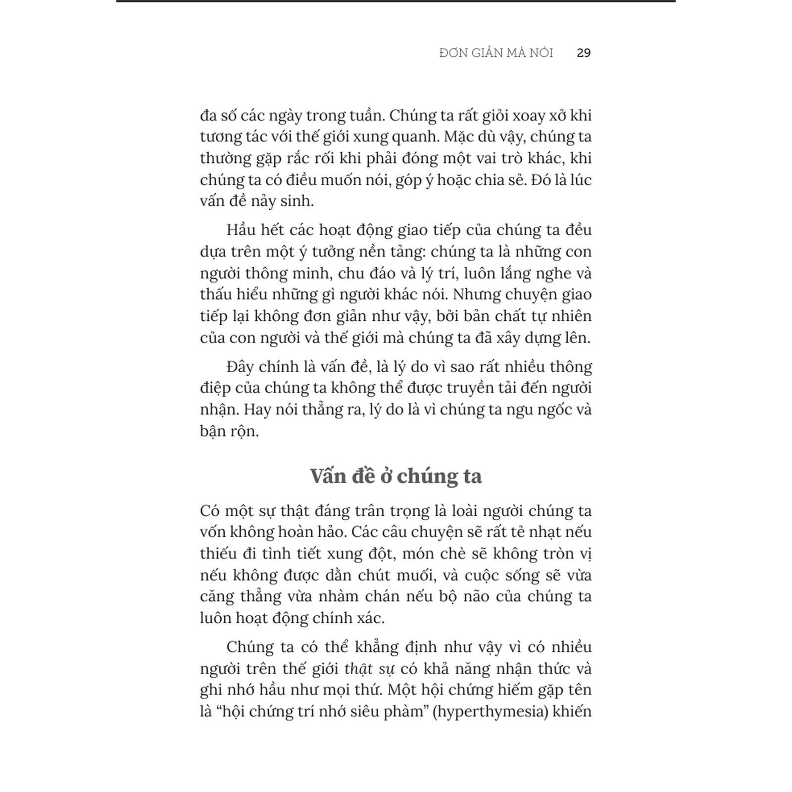 Trong thời đại tràn ngập thông tin như hiện nay, những thông điệp đơn giản, rõ ràng sẽ thu hút và thuyết phục hơn những thông tin phức tạp. Chúng ta thường mắc sai lầm khi sử dụng nhiều biệt ngữ và khái niệm phức tạp để gây ấn tượng, nhưng điều đáng buốn là nó lại cản trở quá trình giao tiếp. Nắm bắt được điều này, chuyên gia marketing Ben Guttmann đã cho ra đời cuốn sách “Đơn giản mà nói” (tựa gốc: Simply Put) để chia sẻ những công cụ vô cùng hữu ích của nghệ thuật truyền tải thông điệp đúng trọng tâm cũng như những yếu tố khoa học tác động, giúp các cá nhân và doanh nghiệp trở nên nổi bật hơn.