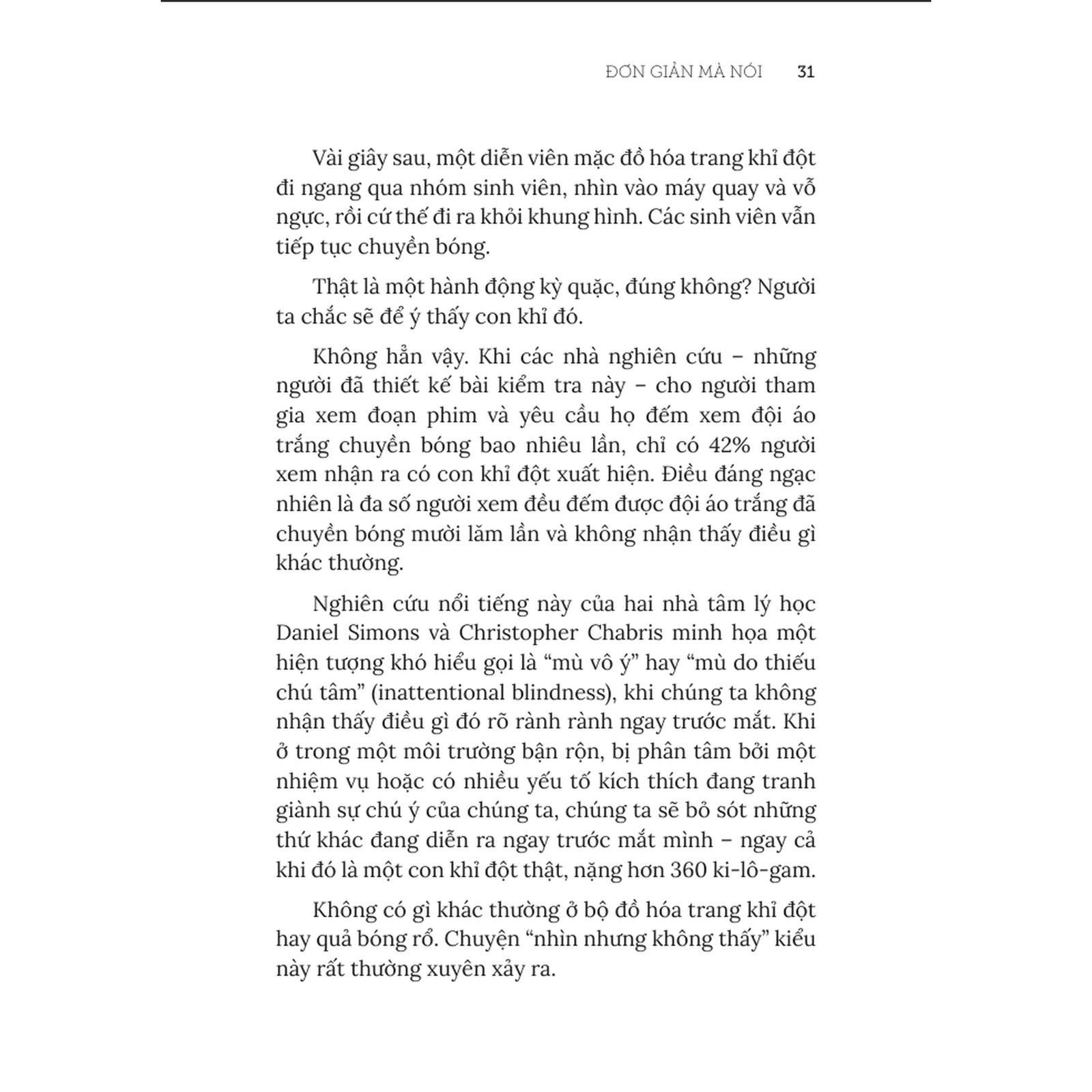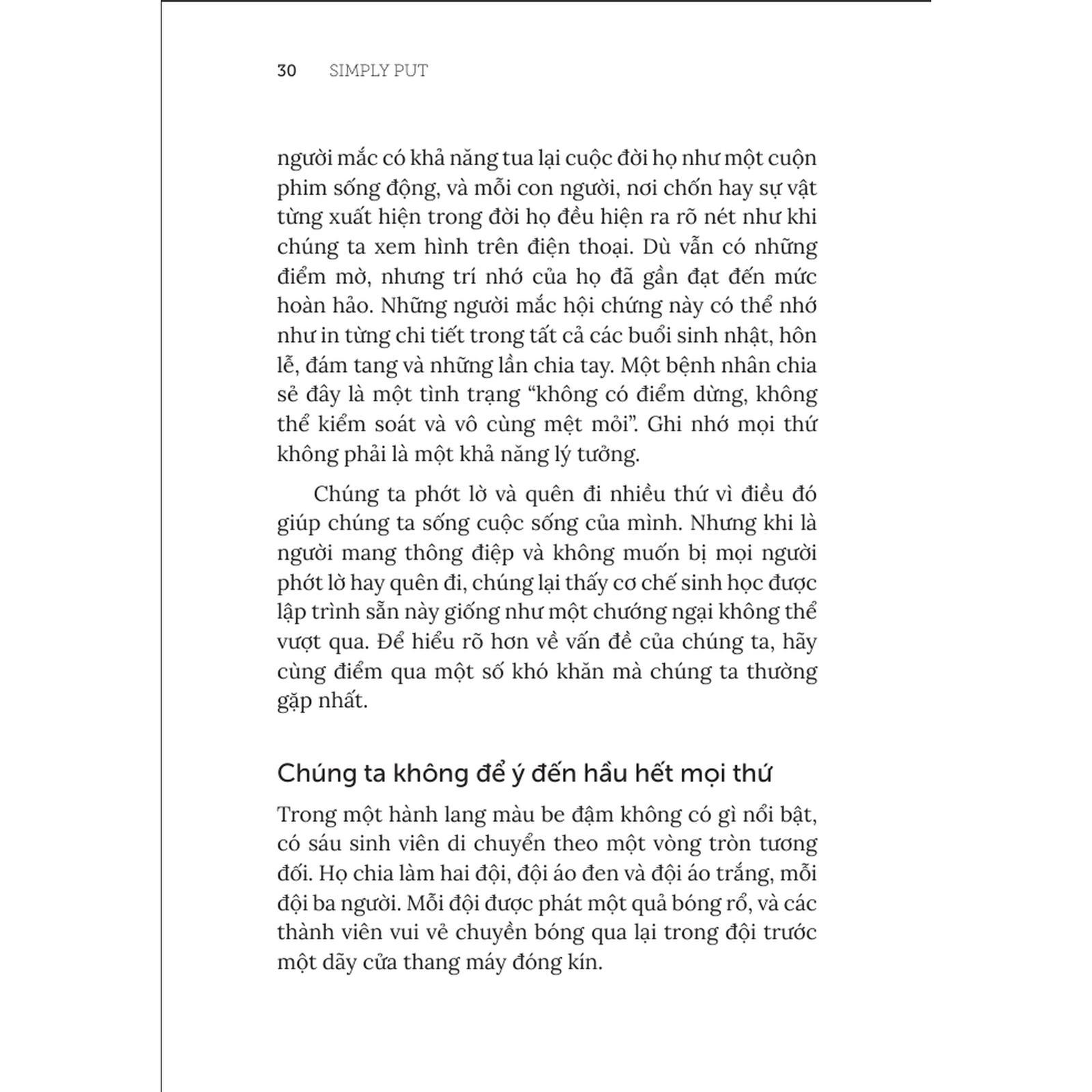 Trong một thế giới không ngừng “dội bom” chúng ta với hàng triệu thông tin mỗi ngày, sự đơn giản chính là chìa khóa để thông điệp của bạn không bị hòa lẫn trong ma trận đó. Mở đầu cuốn sách, Guttmann chia sẻ một số kiến thức cơ bản để giúp chúng ta hiểu rằng bộ não con người rất dễ bị quá tải khi đón nhận nhiều thông tin và yếu tố kích thích. Những thông điệp phức tạp không chỉ khó kết nối với não bộ mà còn thường khiến bộ não bối rối, áp lực và kém tập trung. Ngược lại, thông điệp đơn giản sẽ nổi bật vì chúng dễ hiểu, dễ nhớ và dễ phản ứng.