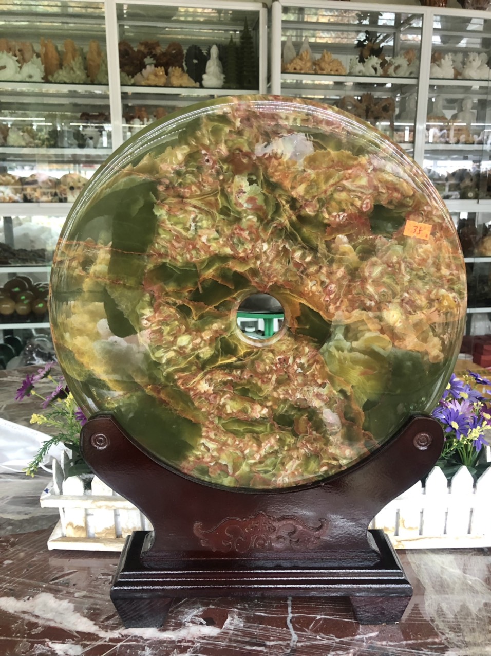 Chất liệu: Đá ngọc Onyx Kích thước: Đường kính 26 cm Khối lượng: 2,7 kg Từ thời xưa xưa, tiền xu được sử dụng với hình dạng tròn tượng trưng cho trời, giữa là hình